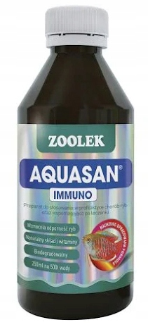 Засіб призначений для використання в профілактиці хвороб риб і як допоміжний засіб після лікування. Продукт зміцнює імунну систему акваріумних і вирощуваних риб, захищає від впливу патогенів і покращує процес лікування. Імуностимулюючий ефект робить риб більш стійкими до хвороб, а також до стресових умов, таких як транспорт. Рекомендовано застосовувати Аквасан Імуно під час карантину риб.