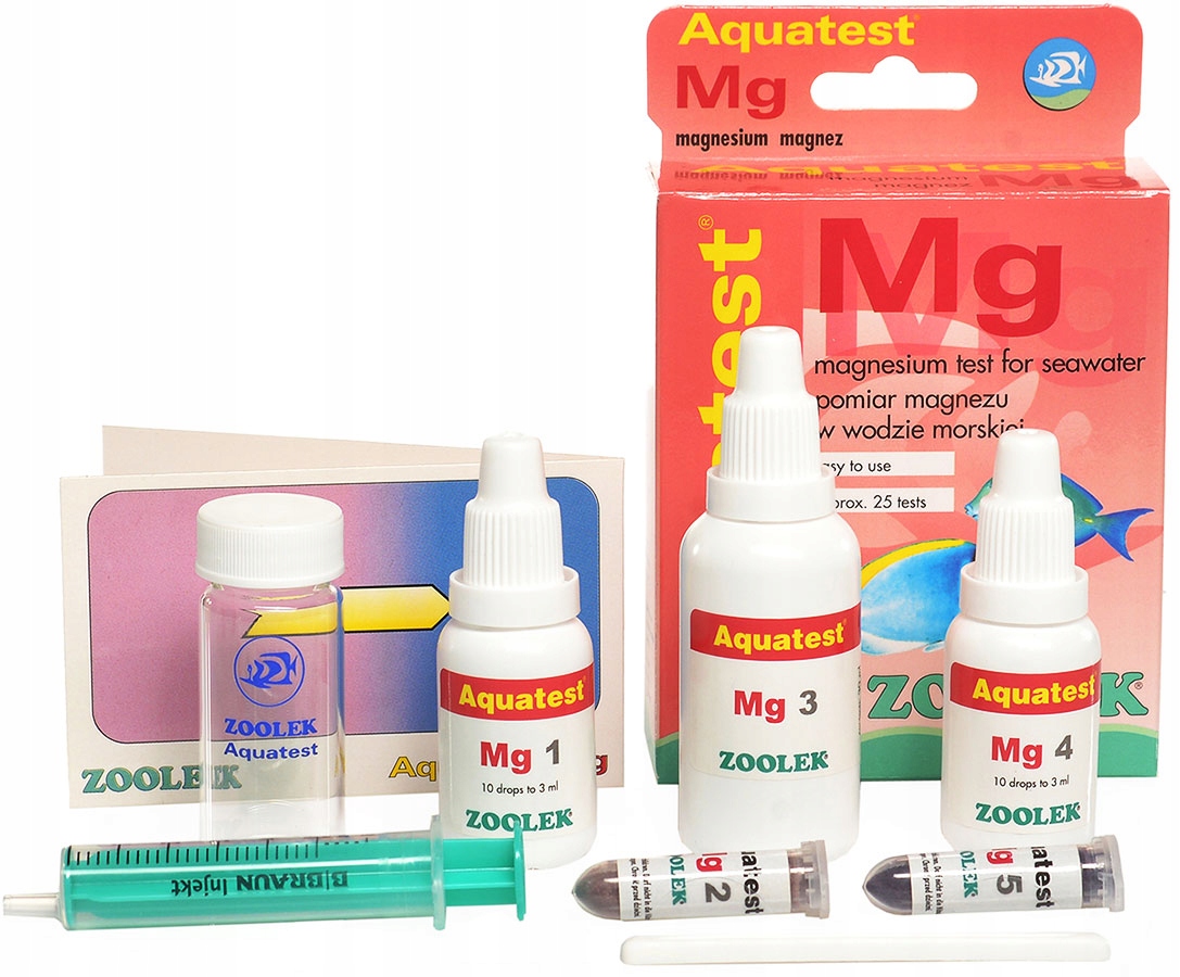 Aquatest Mg використовується для легкого вимірювання вмісту магнію в морській воді. Правильний розвиток багатьох безхребетних, а також декоративних водоростей вимагає підтримки концентрації магнію приблизно на рівні 1300 мг/л. Біологічні та хімічні процеси викликають постійне виснаження магнію, що створює потребу контролювати та відповідним чином поповнювати його.