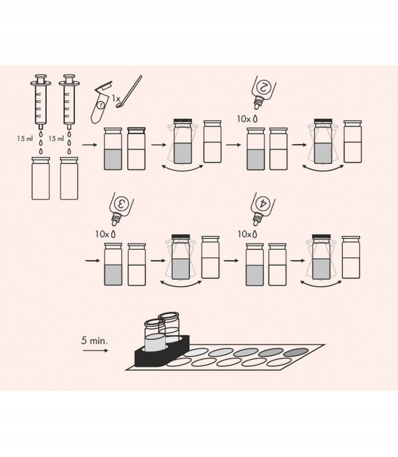 - Налийте одну порцію реагенту 1 в одну пробірку, заповнивши її рівно шпателем, закрийте пробірку пробкою, струсіть до повного розчинення порошку.