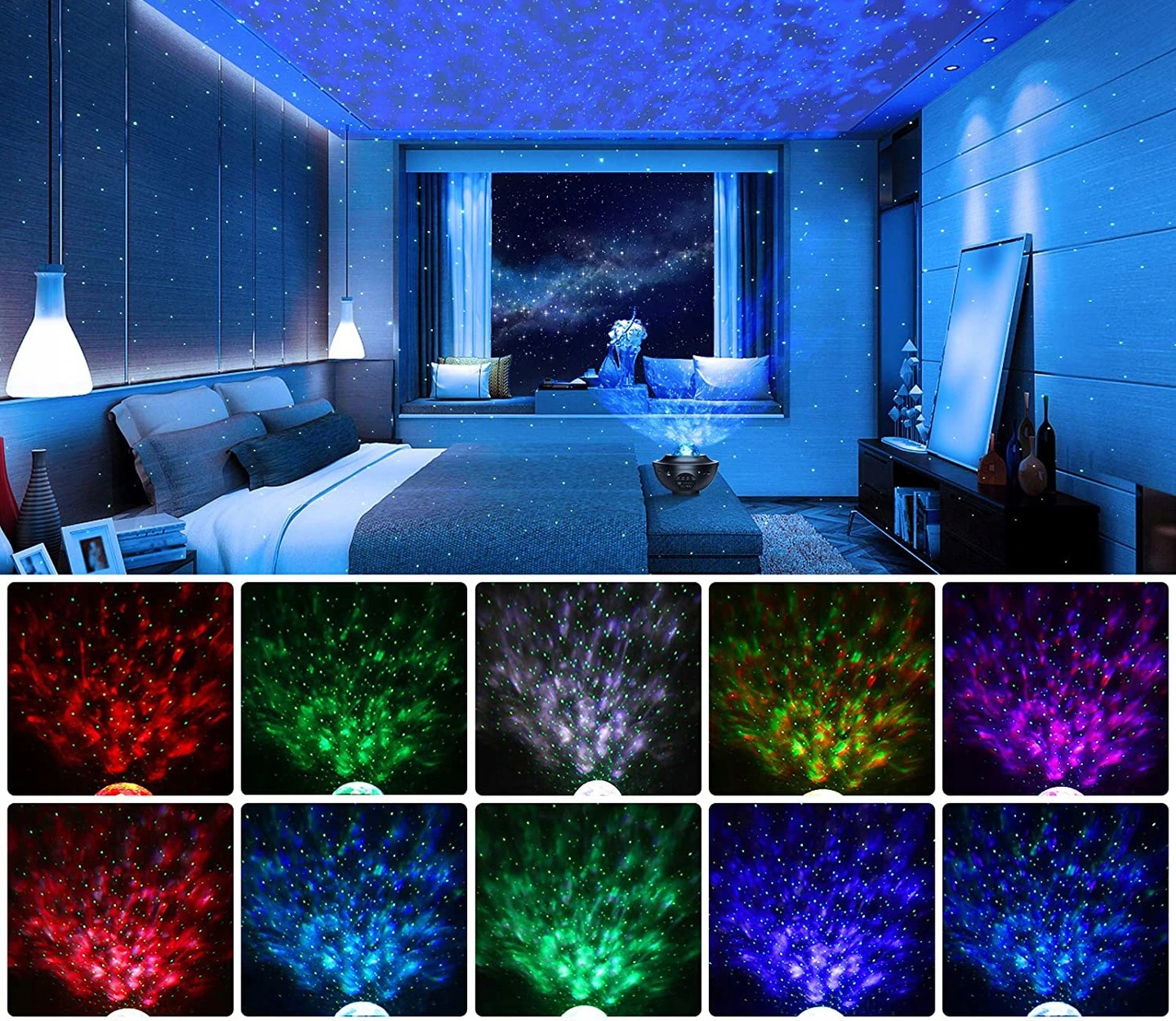 Пристрій обладнаний 4 основними кольорами (синім, червоним, зеленим, білим), червоним та зеленим лазерним світлом та різними режимами миготіння. Завдяки вашому вибору, у вас є шанс створити власну океанську хвилю або зіркову спритну, залежно від вашого настрою.