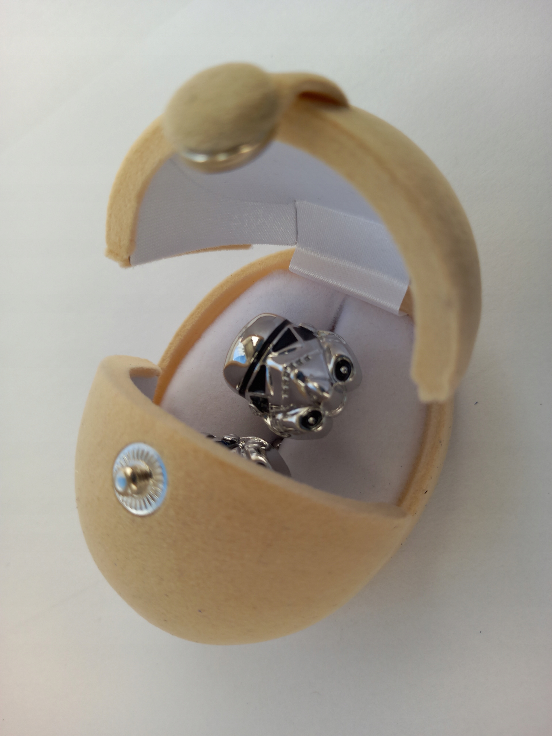 Набір манжети для захоплюючих сорочок, з ексклюзивною обмеженою серією "Зоряних війн" - "Зоряні війни". Зазюки у вигляді шолома мініатюрного клону були упаковані у корпус Чубакі (Chewbacca), спеціально розроблений для цих манжети, що нагадує літаючий транспортний засіб Зоряних воєн із відкритими кварталами, закріпленими засувкою. Це виглядає дуже вражаюче, саме тому це ідеальна ідея подарунка для шанувальника "Зоряних воєн". Зазюки виготовлені з сріблястого металевого гальванічного хрому і пофарбовані акриловими емалами.