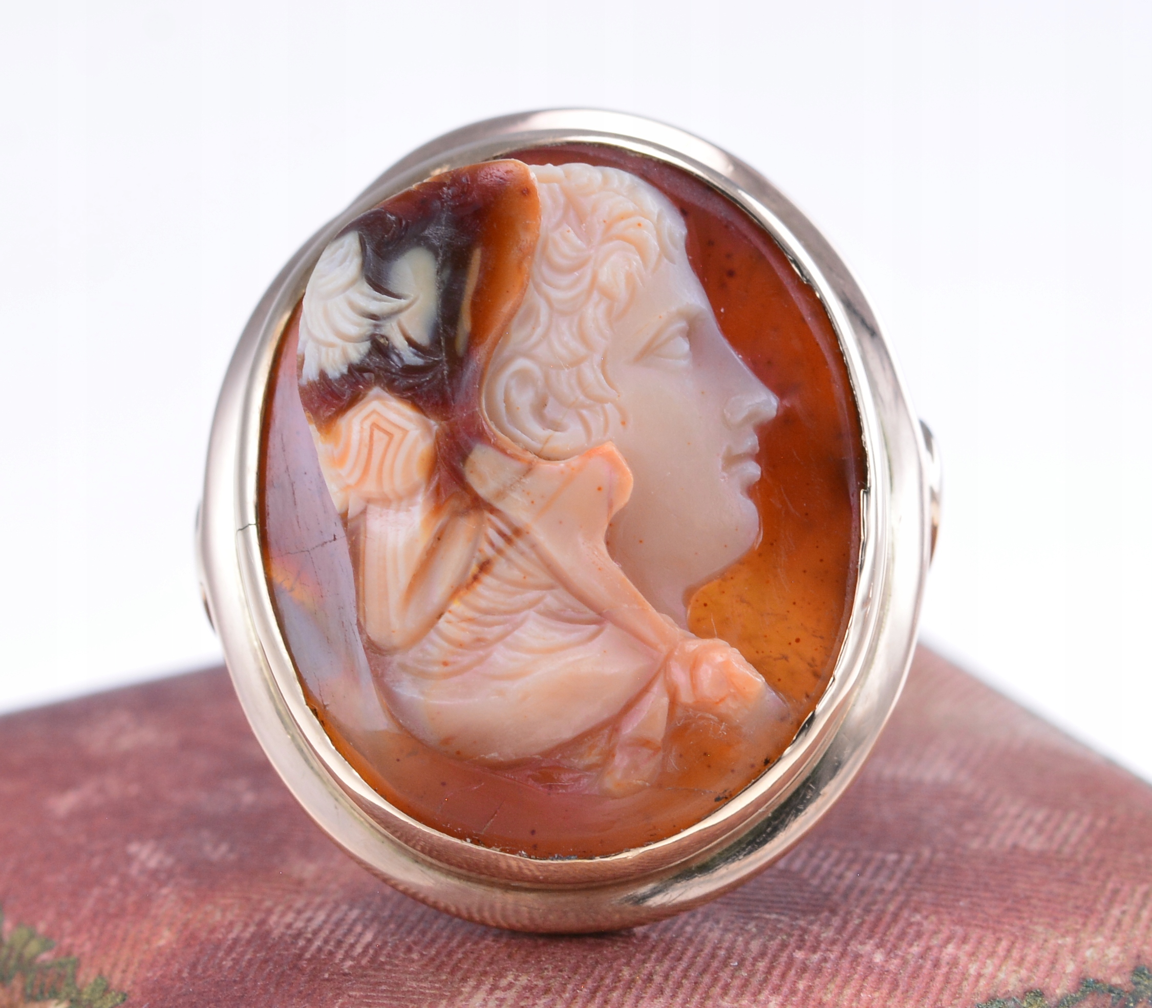 Дуже хороший стан. Камея повністю, без тріщин. Кільце було очищено та відшліфоване, воно готове до надягання. Декоративна коробка включена.