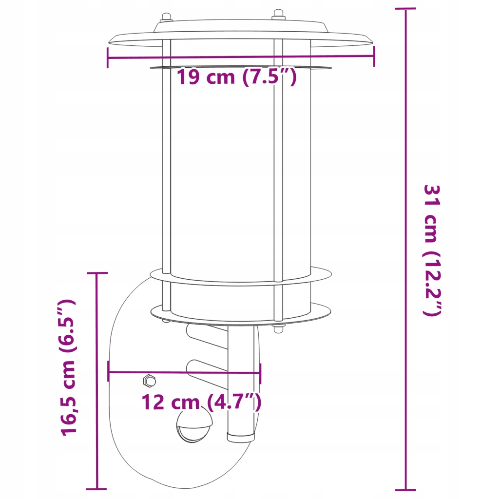 - Датчик руху PIR: Зовнішня настінна лампа оснащена побудованим датчиком руху PIR (пасивного інфрачервоного датчика) з кутом виявлення 120 ° та ефективним діапазоном до 10 м. Світло вмикається автоматично після виявлення, а час освітлення можна встановити в діапазоні від 8 секунд до 3,5 хвилин.