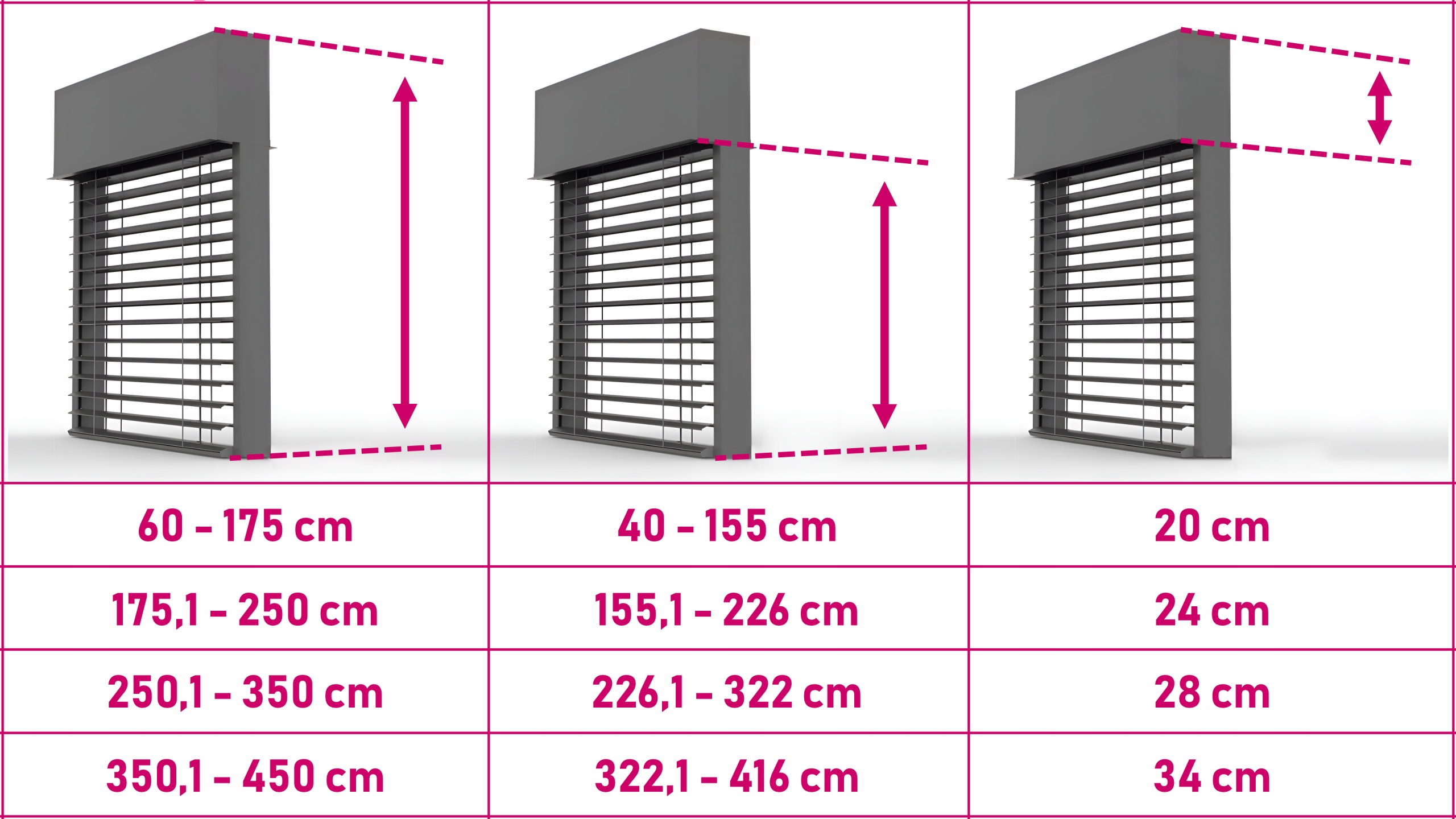 Перевірте в таблиці, яку висоту коробки (H3) вибрано для заданої висоти жалюзі (H1) або висоти вікна (H2).