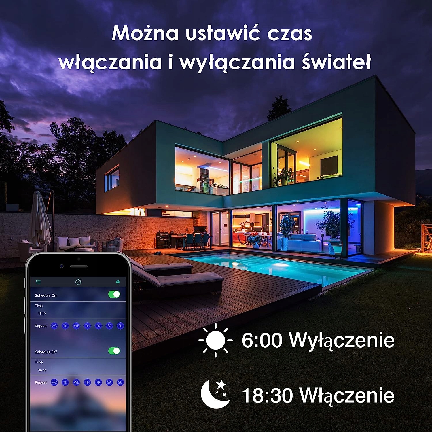 Ви можете встановити час увімкнення та вимкнення в додатку, щоб світло вмикалося та вимикалося автоматично щодня, звільняючи наші руки та полегшуючи життя. Білий стробоскоп ідеально підходить для декорацій на Хелловін і імітує ефект спалаху. Швидкість, з якою блимає світло, можна регулювати для досягнення будь-якого бажаного ефекту