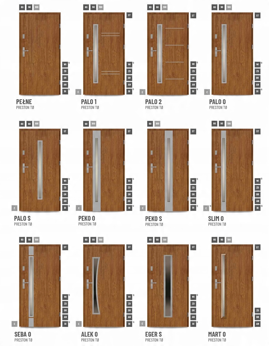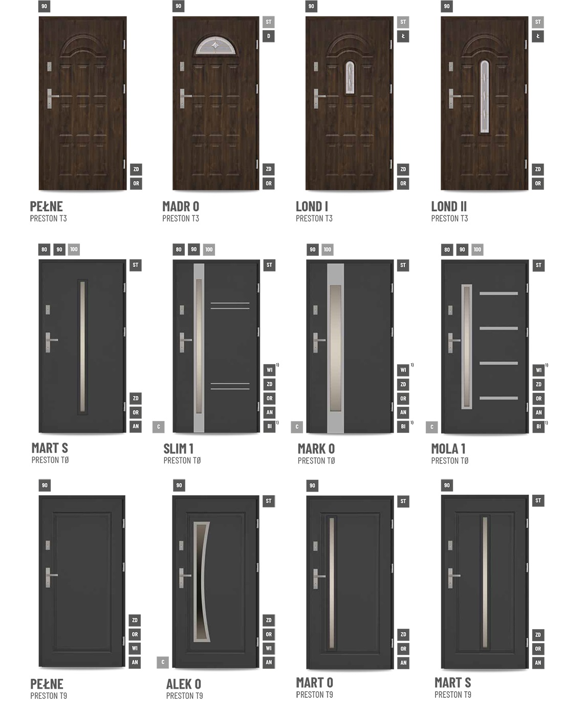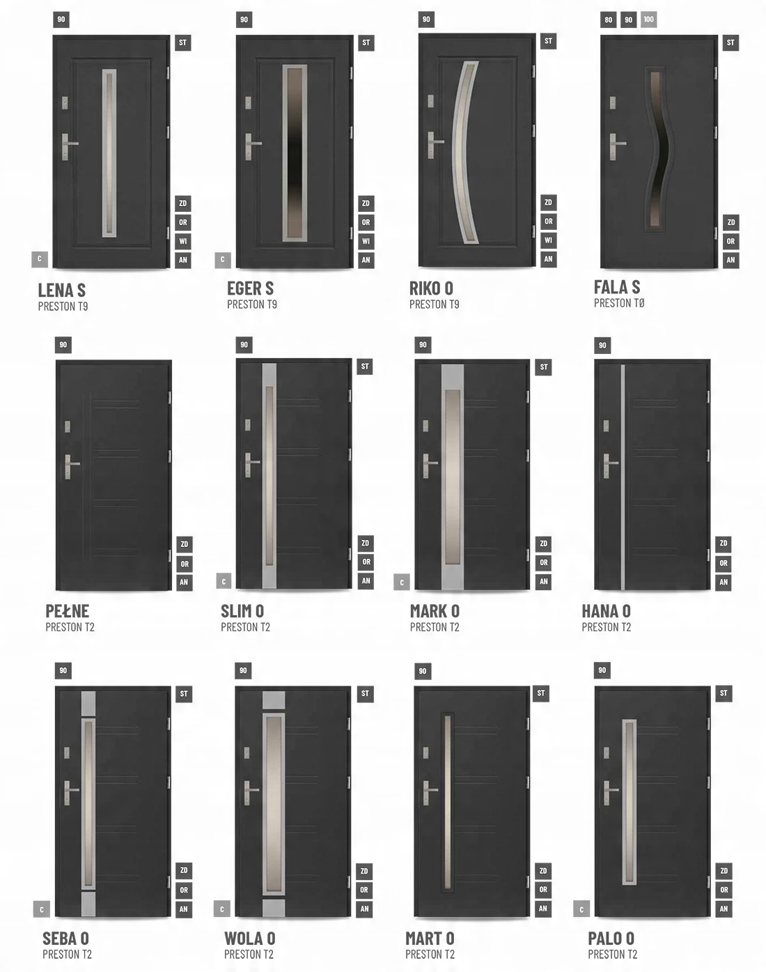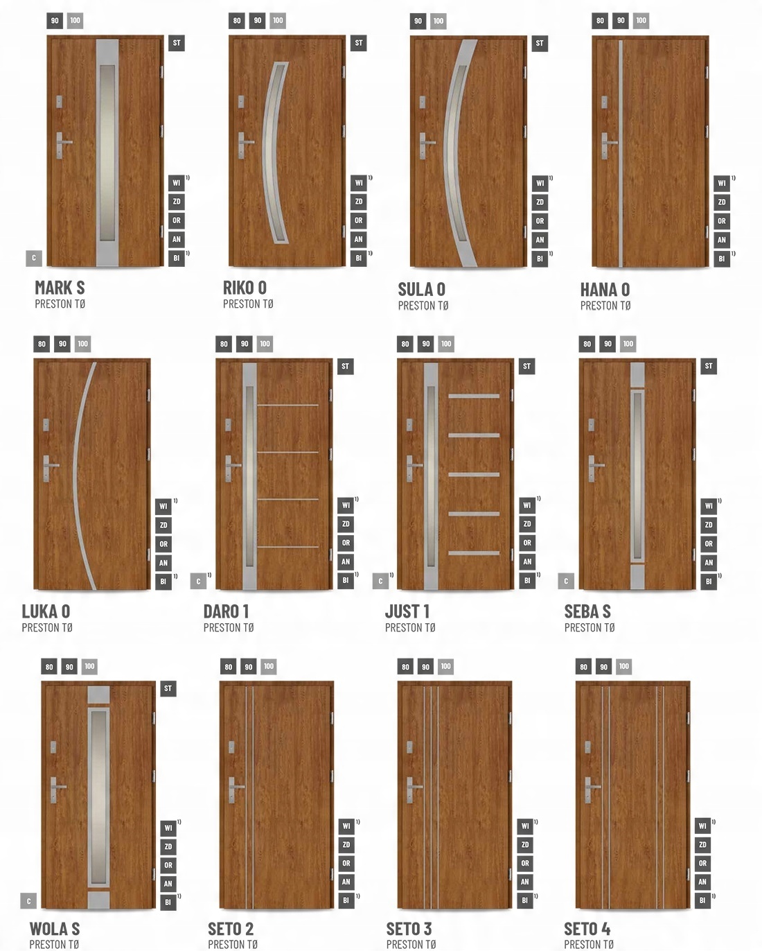 Зовнішні вхідні двері з колекції Preston - це дешевша альтернатива з хорошими параметрами ізоляції, а їх найбільша особливість - товщина крила, яке становить 68 мм . Вони зберігають адекватну довговічність і мають широке обладнання в стандарті, що рідко в такому ціновому діапазоні. Колекція зовнішніх дверей Preston може похвалитися багатою палітрою моделей різних розмірів та модними кольорами.