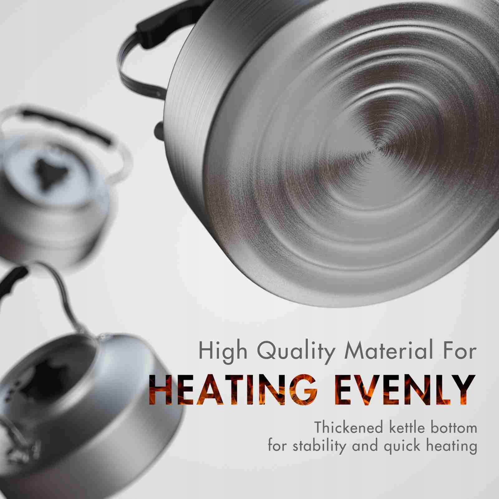 - Висока якість: Чайник виготовлений з алюмінію та покрита анодованою поверхнею, яка дуже легка, анти -боборована та антикорозійна. Зроблений з нержавіючої сталі, кружок легко чистити, стійкий до іржі та вільного запаху. Дизайн подвійного шару запобігає збудженій гарячій воді, чаю або кави, ви можете використовувати цей чайник, щоб кип’ятити воду для приготування чаю та кави.