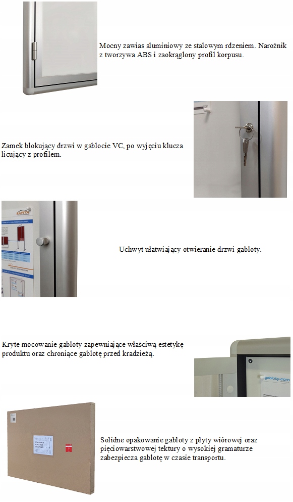 ВК -зовнішні вітрини , призначені для представлення, серед інших, оголошень, інформації чи плакатів. Шафи, оснащені ущільнювачами, щоб запобігти потраплянню води. Корпус дисплея встановлюється на сильних алюмінієвих петлях зі сталевим серцевиною. У дверях ми встановлюємо замки та ручки для відкриття вітрини та скління, виготовленого з суцільного полікарбонату. Перевага зовнішніх вітринів VC - їх товщина - лише 3 см. Інформація у зовнішніх вітринах додається з магнітами, бажано неодимовими, доступними в нашій пропозиції. Ми виробляємо дисплейні корпуси із срібного анодованого алюмінію. Кути, що з'єднують профілі, виготовлені з пластику ABS. Зовнішній рекламний дисплей ідеально захищений від крадіжок завдяки використанню внутрішніх внутрішніх збірок - забезпечуючи при цьому правильну естетику продукту. Матеріали, що використовуються для виробництва зовнішніх вітрин, відповідають необхідним стандартам для них.