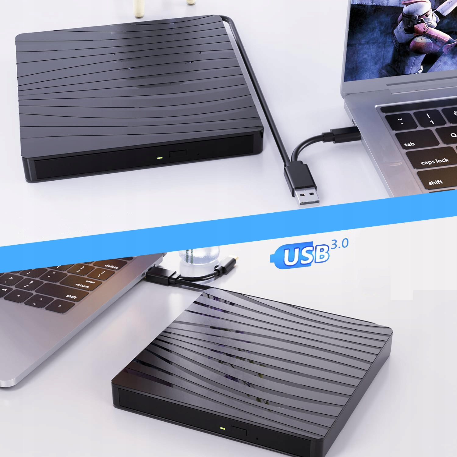 Зовнішній DVD-привід, не потрібні додаткові драйвери чи живлення, просто підключіть зовнішній компакт-диск/ під’єднайте DVD/рекордер до порту USB 3.0, зовнішній пристрій для читання дисків буде автоматично розпізнано комп’ютером, дуже простий у використанні.