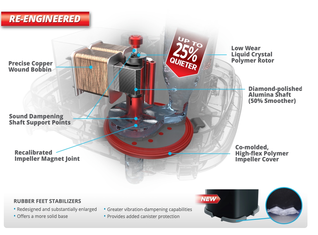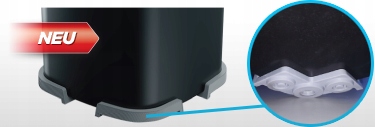 - Переглянуті та значно збільшені гумові стабілізатори ніжок забезпечують покращене гасіння вібрації та додатковий захист для контейнера фільтра