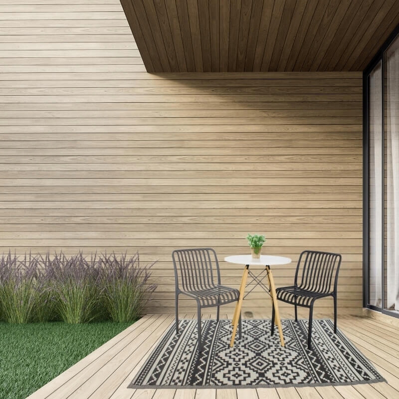 килим, виготовлений з поліпропілену, відомий своєю силою, ідеально підходить для місця, що піддаються зміні погодних умов. Він стійкий до вологи, ультрафіолетового випромінювання та вицвітання, що забезпечує тривалий естетичний вигляд.