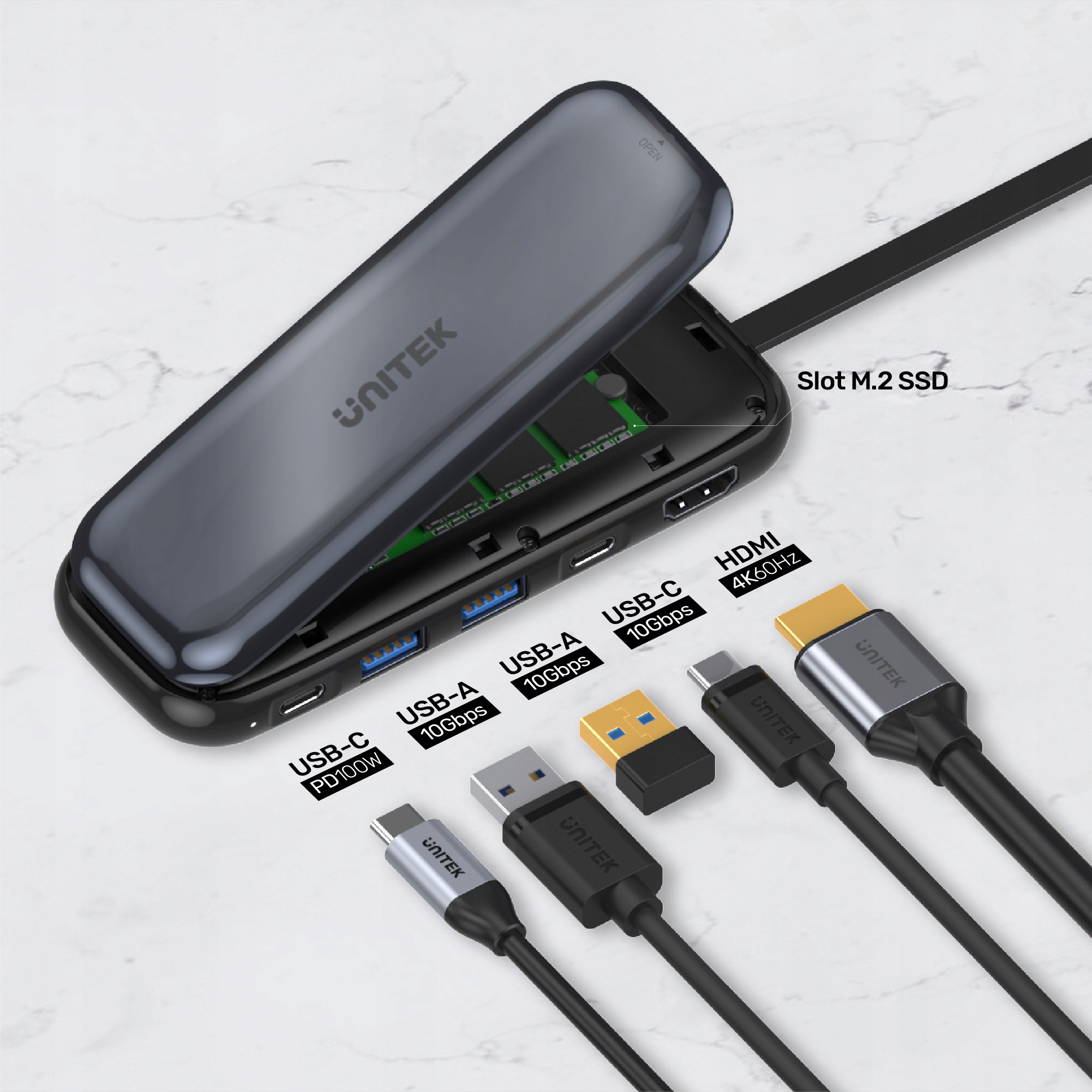 Хаб має шість портів: USB-C із зарядкою 100 Вт, два порти USB-A з максимальною швидкістю передачі даних 10 Гбіт/с, один USB -C порт з максимальною швидкістю передачі даних 10 Гбіт/с, порт HDMI Ultra 4k 60 Гц, а також HDR і HDCP 2.3/1.4. і слот M.2 SSD.