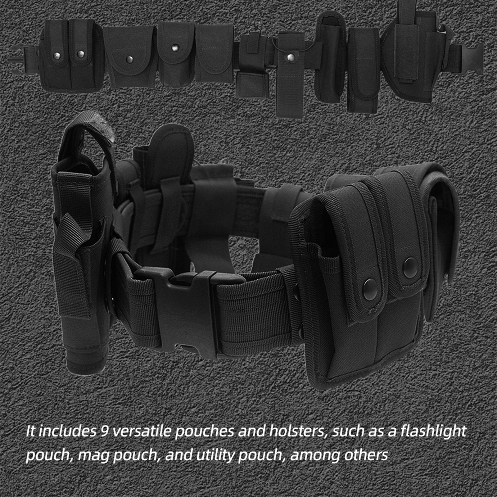 - Цей регульований ремінь, оснащений кількома мішками та кобурами, є чудовим спорядженням, яке підходить для використання поліцією, охороною, правоохоронними органами та військовими. Його можна відрегулювати відповідно до різних розмірів талії.