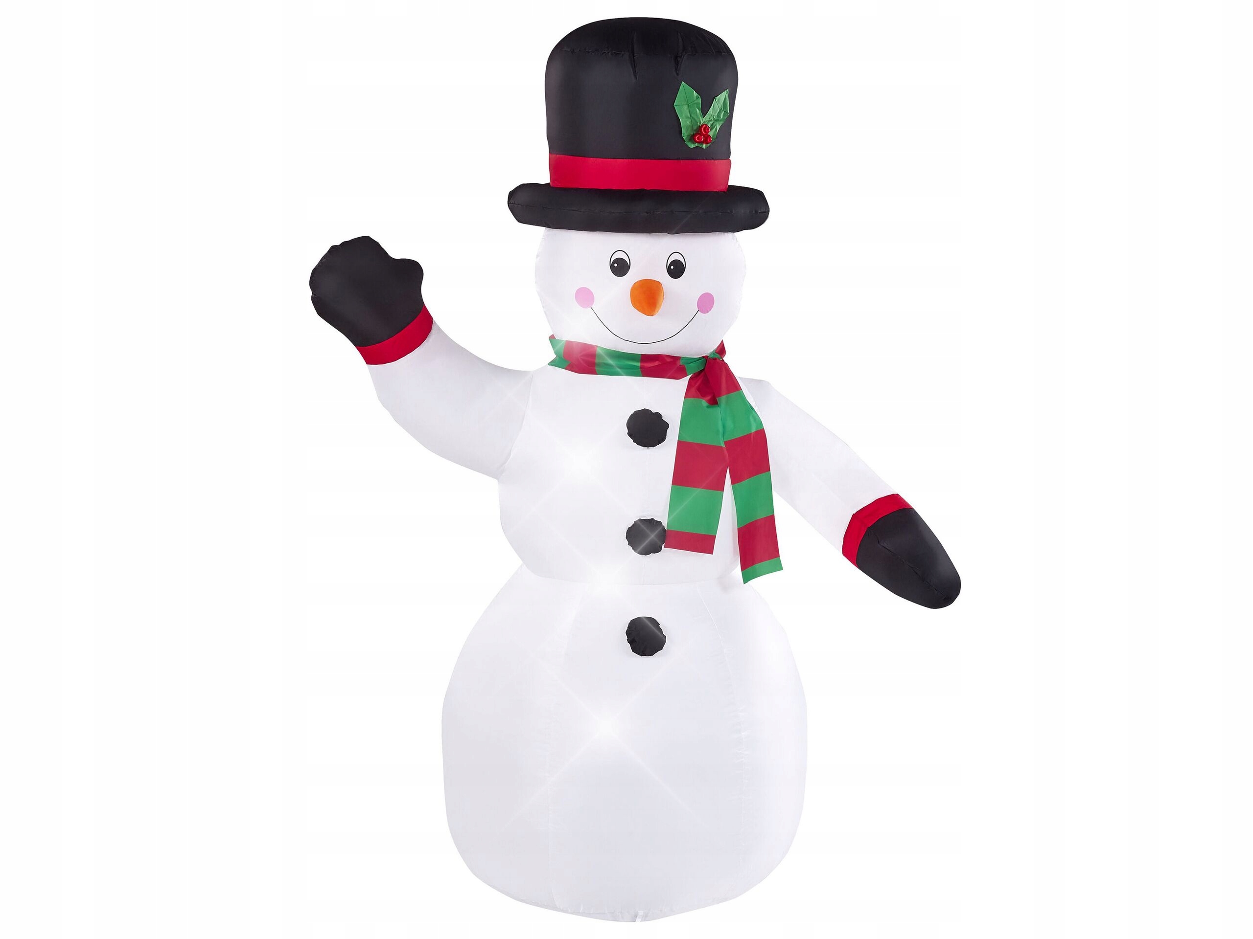 Навіть у холодні та похмурі дні ця надувна прикраса створить у вашому саду веселу атмосферу. Чарівна фігурка сніговика в капелюшку з піднятою рукою в привітанні миттєво поверне всіх у новорічний настрій. Завдяки включеним світлодіодам з електричним живленням прикраса виглядає красиво після настання темряви. Висота надувного декору становить два метри, що робить його ідеальною прикрасою біля входу у ваш дім.