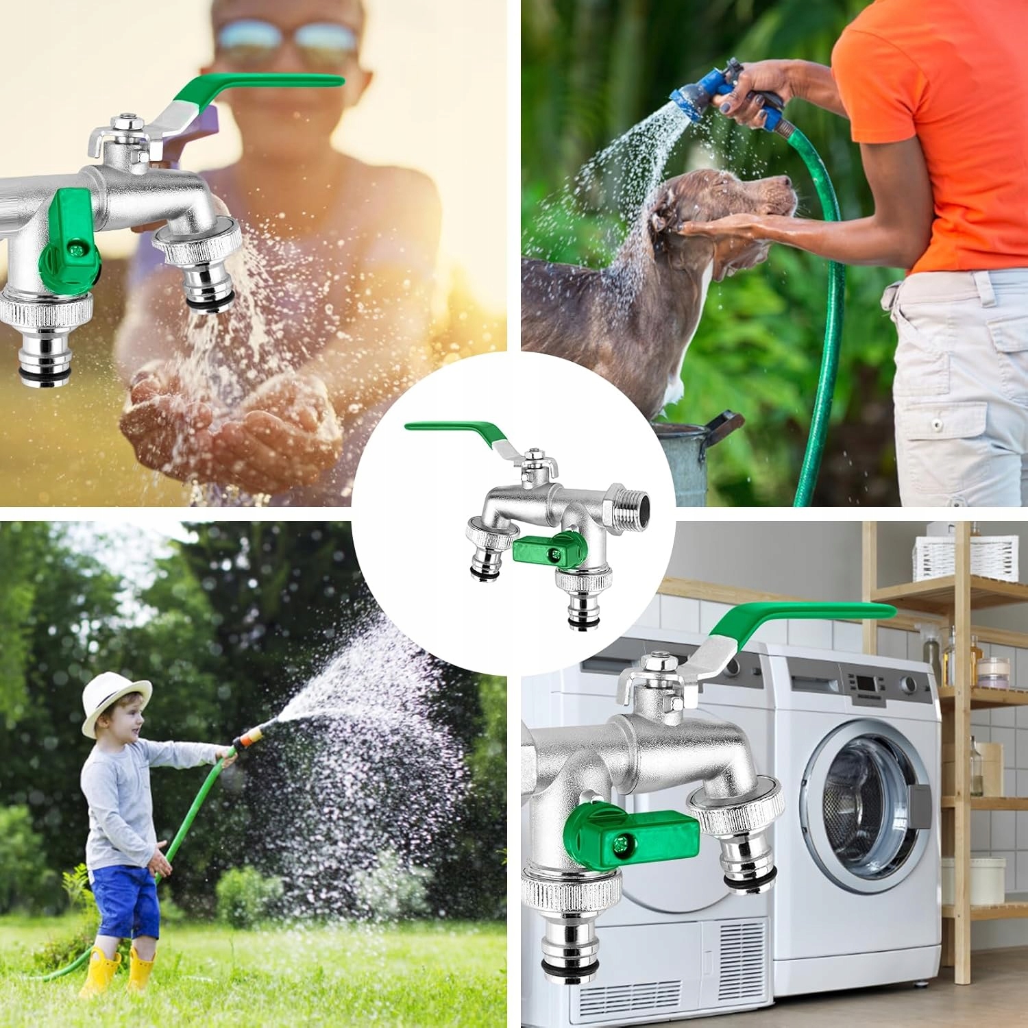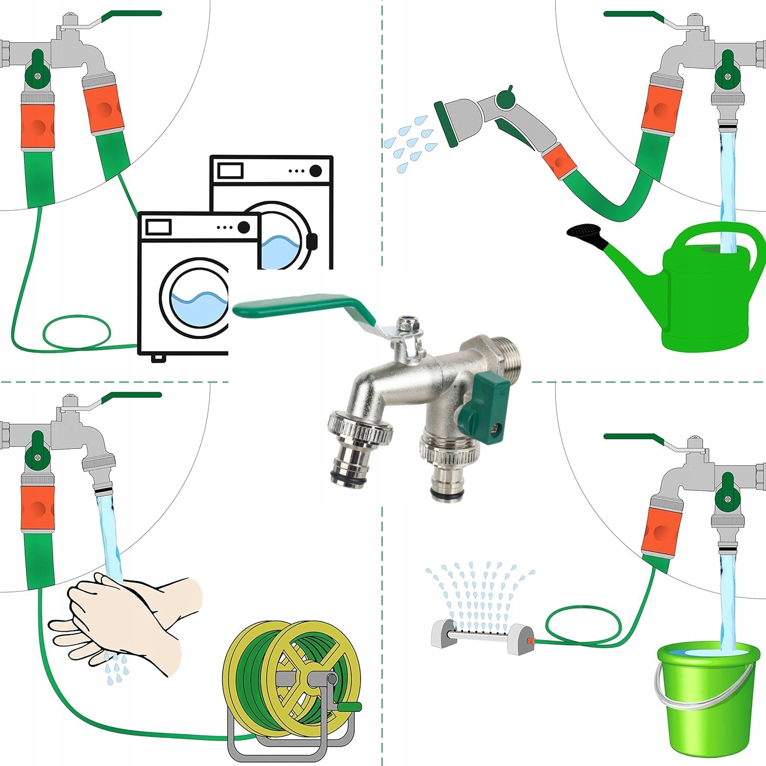 Цей подвійний кран є універсальним рішенням для дому, саду та промисловості. Ідеально підходить для поливу, підключення пральної машини, автомийки, садового шланга або дощової бочки. Його міцна зовнішня конструкція забезпечує безпеку навіть на відкритому повітрі, а його точне виготовлення дозволяє підключати його як до пральних машин, так і до чайників.