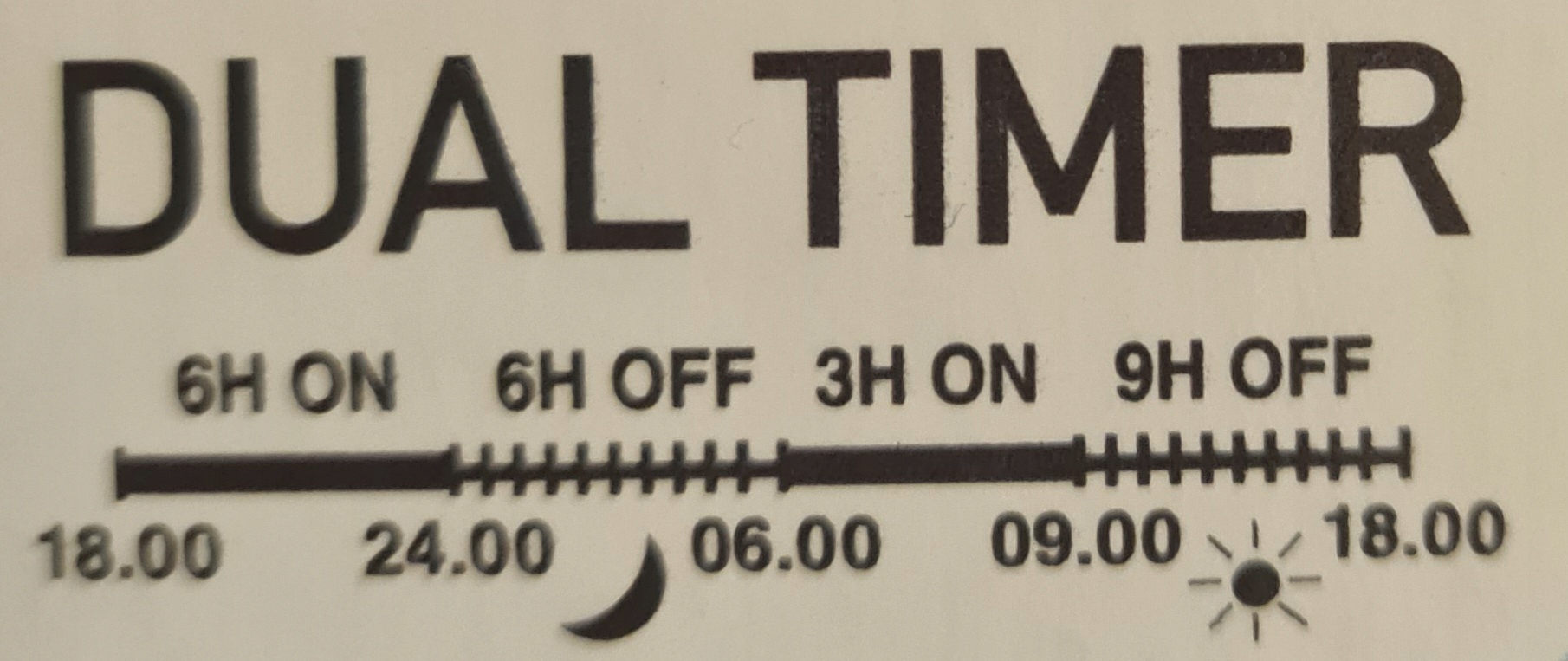 - Подвійний таймер: 6ON/6Off 3ON/9Off Plus безперервна робота