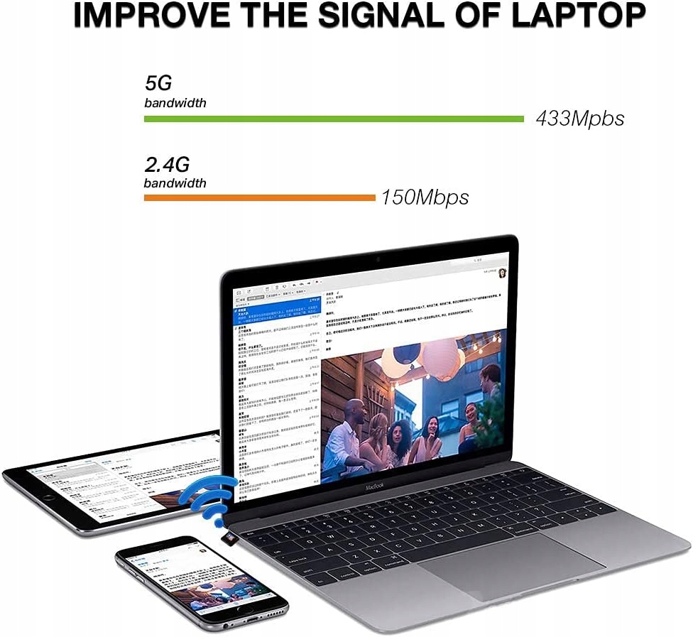Швидкий бездротовий USB-адаптер 802.11ac b > Швидкість Wi-Fi до 600 Мбіт/с у діапазонах 5 ГГц (433 Мбіт/с) або 2,4 ГГц (150 Мбіт/с). Він ідеально підходить для плавного потокового передавання у форматі HD, онлайн-ігор та інших завдань, які потребують великої пропускної здатності.