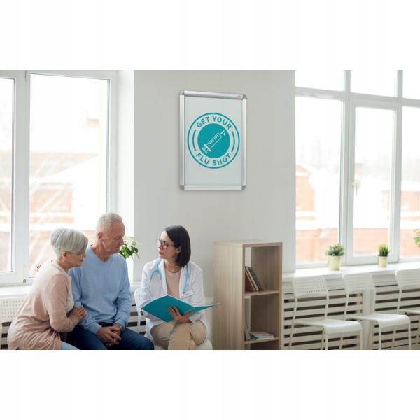 Алюмінієва рама. Оснащений протирефлекговою кришкою ПВХ , яка захищає від пилу та бруду, а алюмінієвий каркас для естетичного вигляду. Використовуйте рамки та стелажі з засувкою, щоб піклуватися про координований та ефірний вигляд ваших оголошень. Формат A2.
