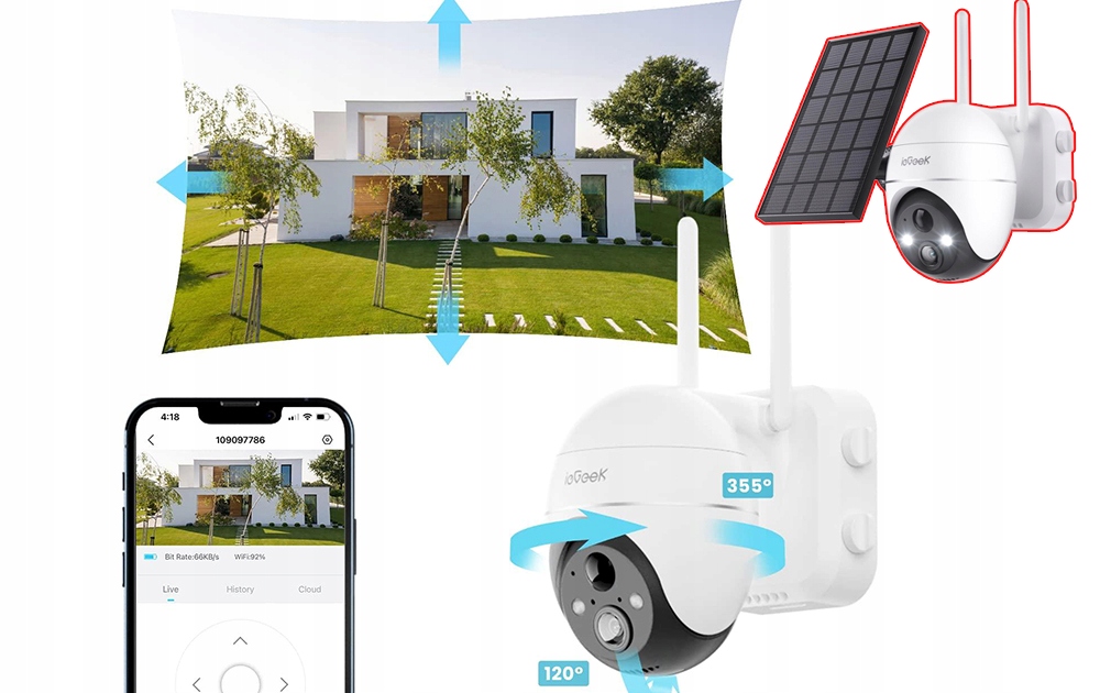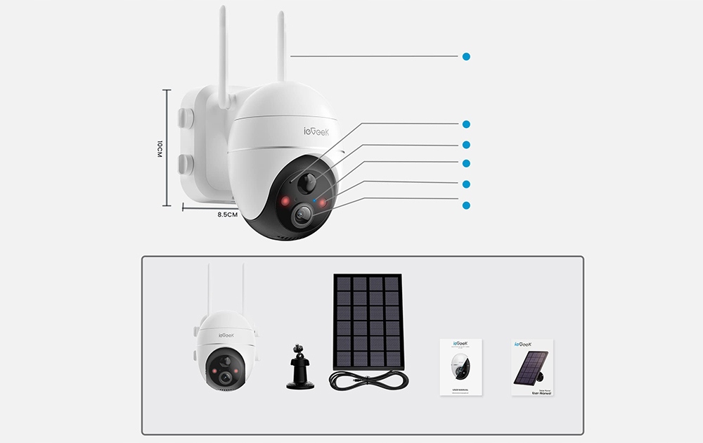 Зовнішня камера спостереження ieGeek із сонячною панеллю та внутрішнім акумулятором ємністю 9000 мАг, що економить вам на заміні батарей, працює цілих 365 днів. У камері використовується подвійна антена 4Dbi, завдяки чому вона дуже добре приймає сигнал WiFi, підтримує WiFi 2,4 ГГц. 100% бездротова камера без кабелів, проста в установці.