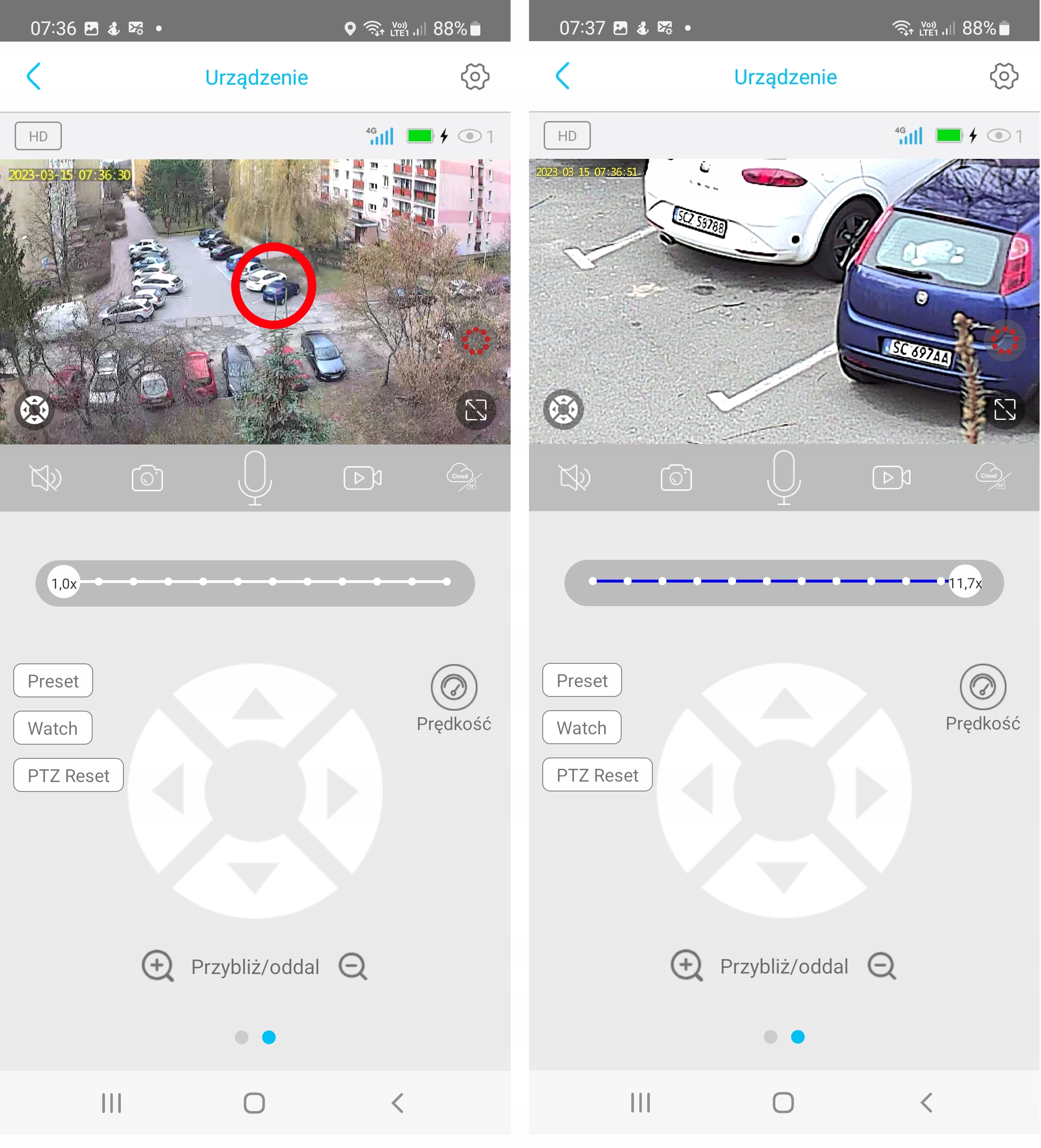 Камера має дві лінзи діаметром 3,6 мм і 16 мм, що дозволяє знімати великим планом об’єкти, віддалені від камери, і зчитувати, наприклад, номерні знаки на відстані до 80 м.