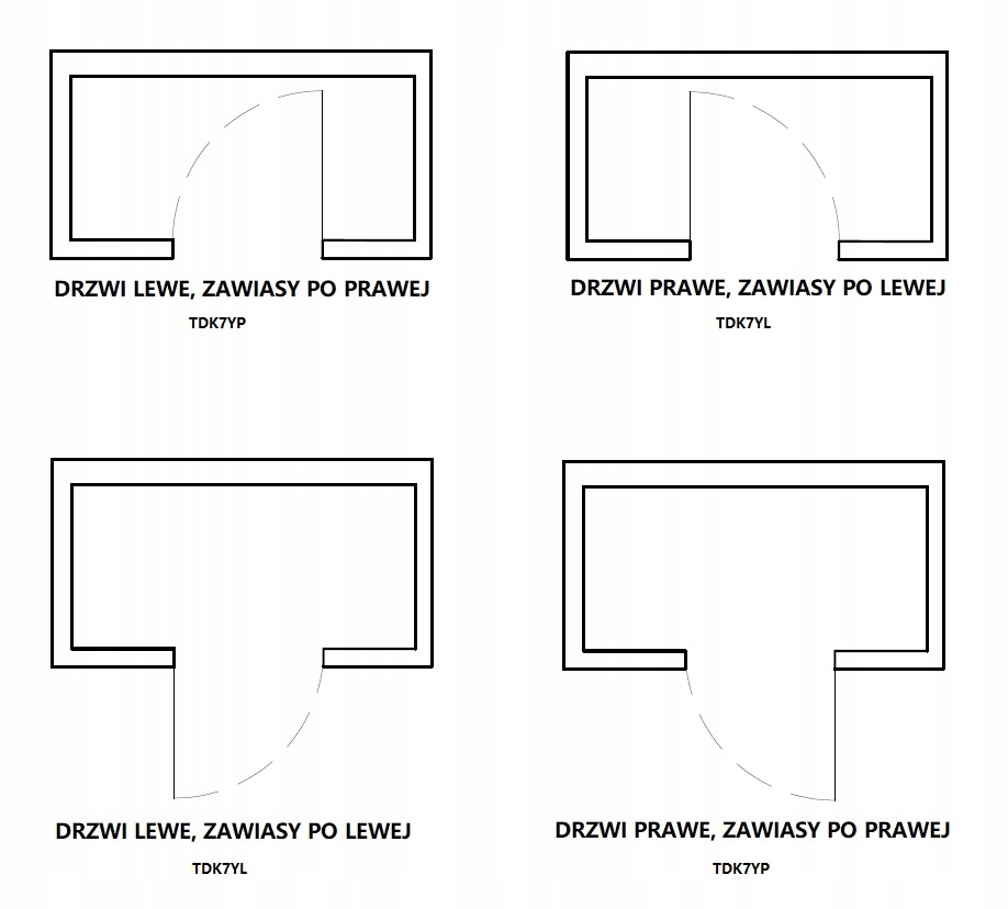 Пропозиція стосується ручки в конфігурації LEFT. Сторону та положення петель можна визначити на малюнку нижче. Наша пропозиція включає ручку в потрібній конфігурації.