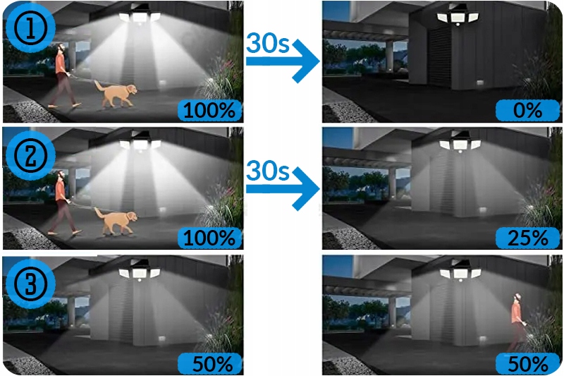 ✅ РЕЖИМ 2 - Лампа переходить в режим очікування після настання сутінків і залишається горіти весь час з потужністю 25%. Коли виявлено рух, він світиться на 100%і через 30 секунд знову світиться на 25%.