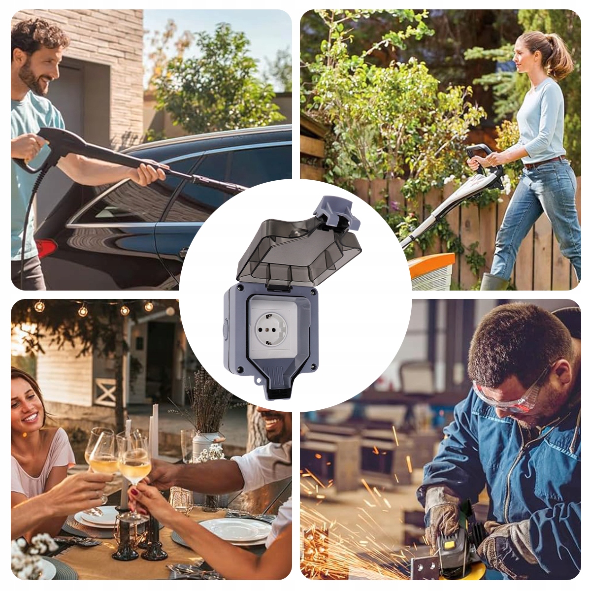 ⏩Зовнішня розетка– водонепроникна розетка використовується на вулиці в пральнях, майстернях, гаражах, садах і басейнах. Він також використовується всередині приміщень, на кухнях, ванних кімнатах і підвалах. Він відповідає високим стандартам якості - виготовлений з термопластику, не містить галогенів і стійкий до багатьох хімічних речовин.