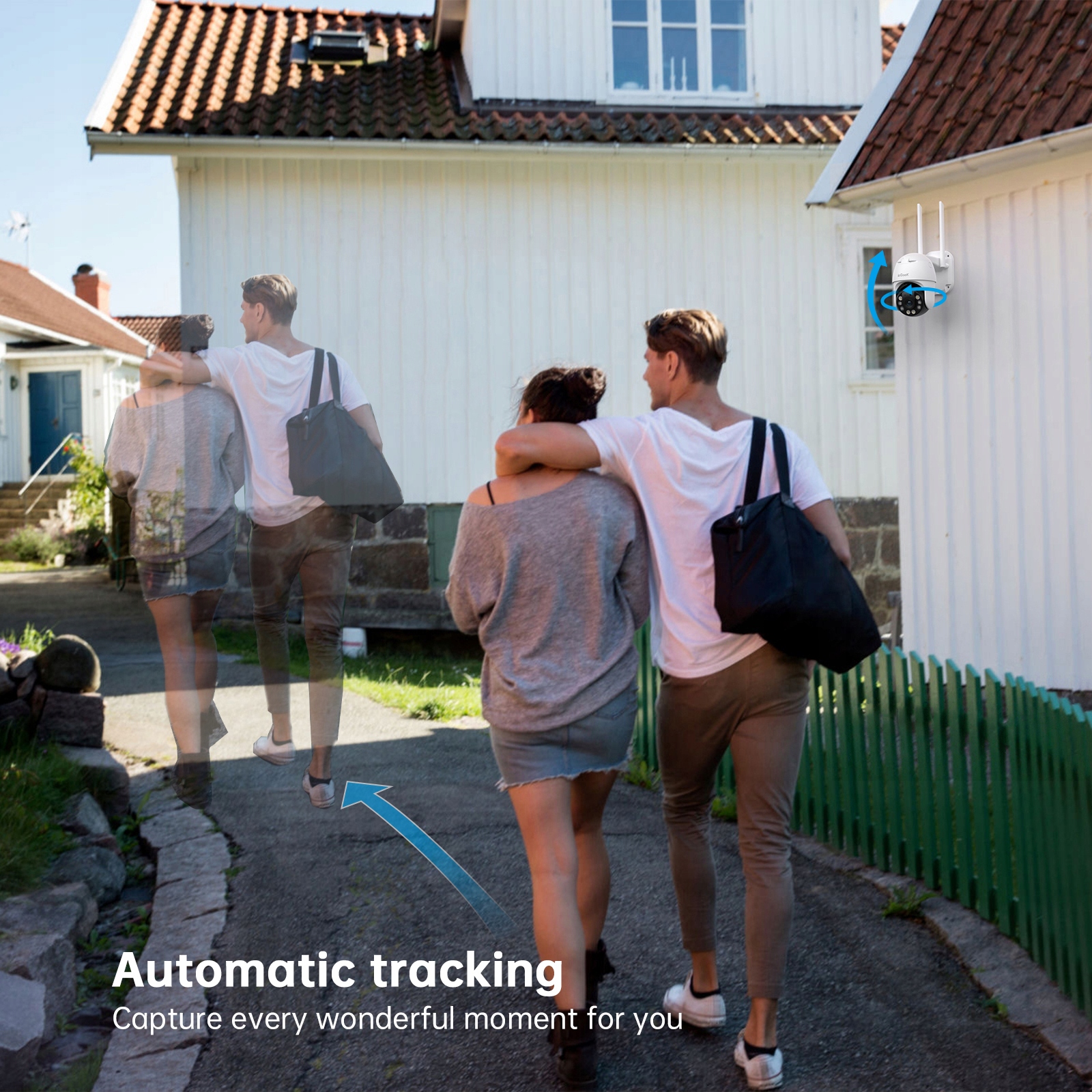 Бездротова зовнішня камера ieGeek підтримує горизонтальне автоматичне відстеження, яке може точно фіксувати кожен момент руху (що може ввімкнути/вимкнути функцію) . Ви також можете вручну панорамувати камеру (355°Панорамування 90°Нахил), щоб знайти область, яку ви хочете переглянути через додаток, і навіть заздалегідь запрограмувати точки моніторингу (до 8). Охоплюйте свій дім на 360°, будьте власним охоронцем.