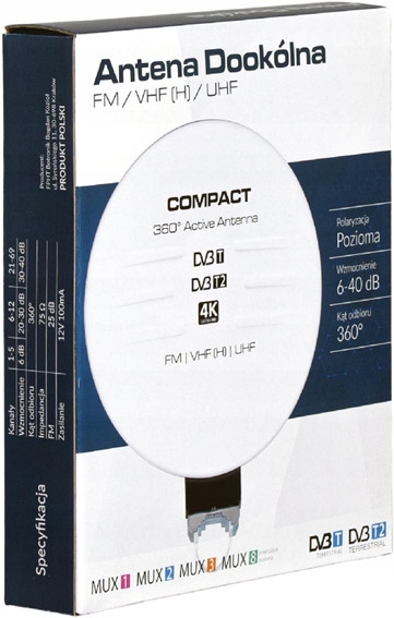 Активна антена з підсилювачем DVB-T/T2 зовнішнім високим для отримання цифрових наземних телевізійних телевізійних станцій, включаючи MUX8 (залежно від міцності передавача). Перевага антени - її невеликий розмір і вага.