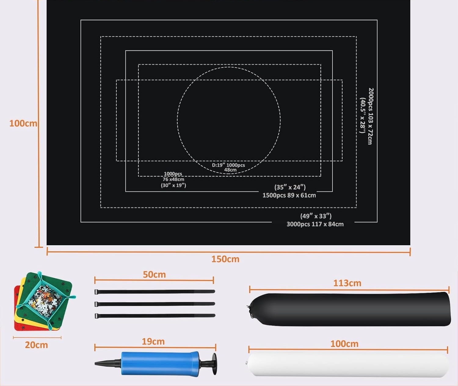 - 【Як використовувати】 - просто покладіть на килимок головоломки, надутуйте трубку і поставте її на обидва сторони килима. Загорніть килимок завищеною трубкою і зав'яжіть її прикріпленими еластичними смугами.