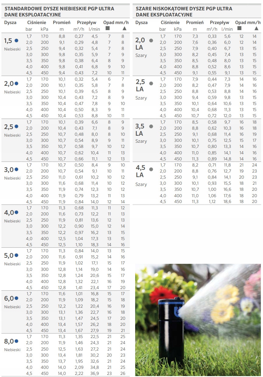 Інші розширені функції спринклера включають 34 форсунки на вибір із кількома діапазонами радіусу, а також регулювальний гвинт. Завдяки опціям, які пропонує PGP Ultra, інсталятор системи може вибрати рішення, які забезпечують оптимальну роботу форсунок на будь-якій місцевості.