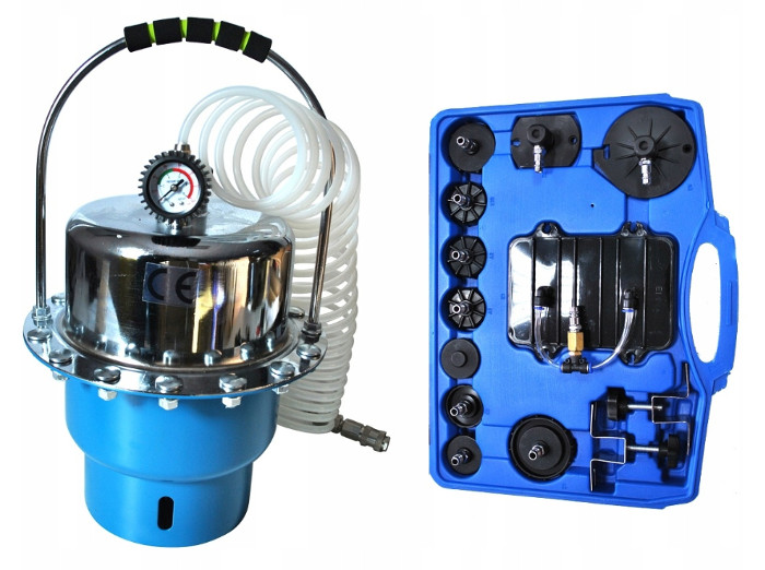 Пристрій для заміни гальмівної рідини та вентиляційної системи адаптерами. Адаптовано до гальмівних рідин DOT3, DOT4 та DOT5.1. Набір оснащений набором пробок для найпопулярніших брендів автомобілів. на силікони.