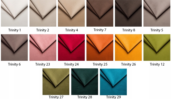 Трініті - популярна оббивна тканина. Його характерна особливість - ніжна структура і поверхня, вкрита дрібним ворсом - м'яка і приємна на дотик. Користується популярністю завдяки тонкому відтінку матеріалу і матовим кольорам. Стійкий до стирання, пілінгу та світла! Тканина має обмежені властивості поглинання рідини, що позитивно впливає на збереження її чистоти.
