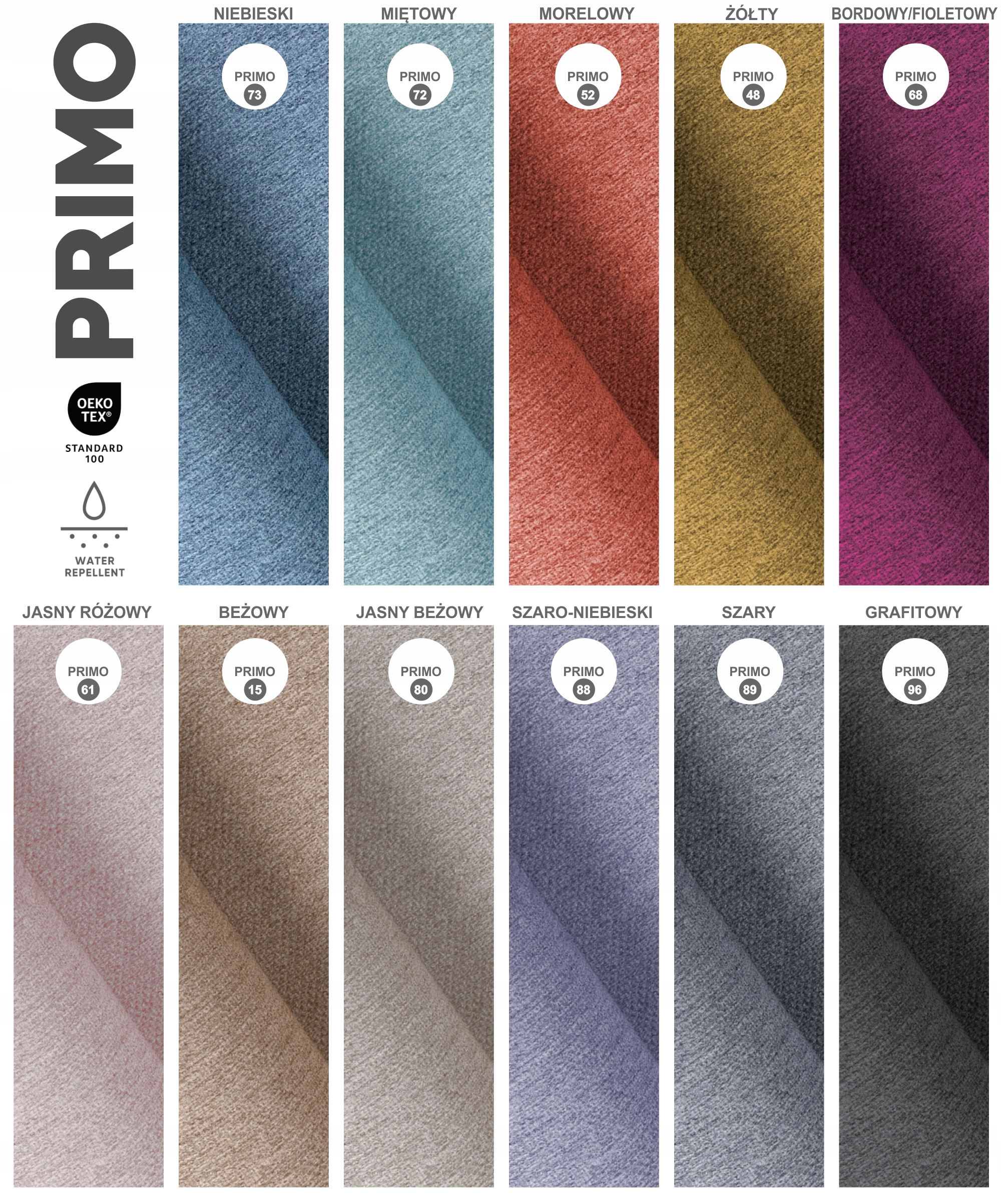 Primo -це делікатна тканина з оббивки з властивостями, що ускладнює поглинання рідини, що значно полегшує очищення. Має видиме переплетення.