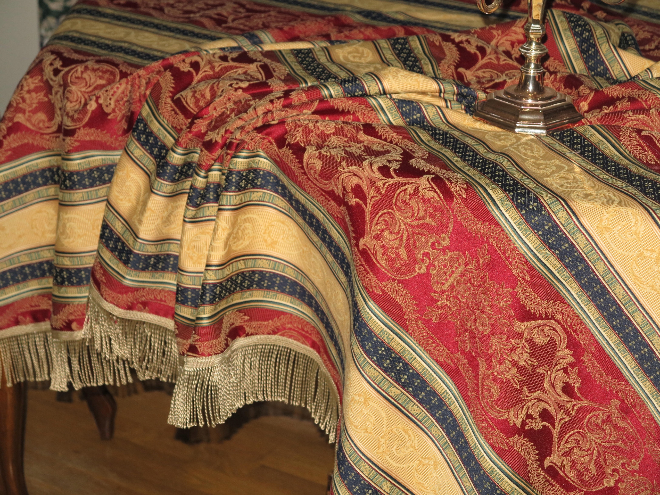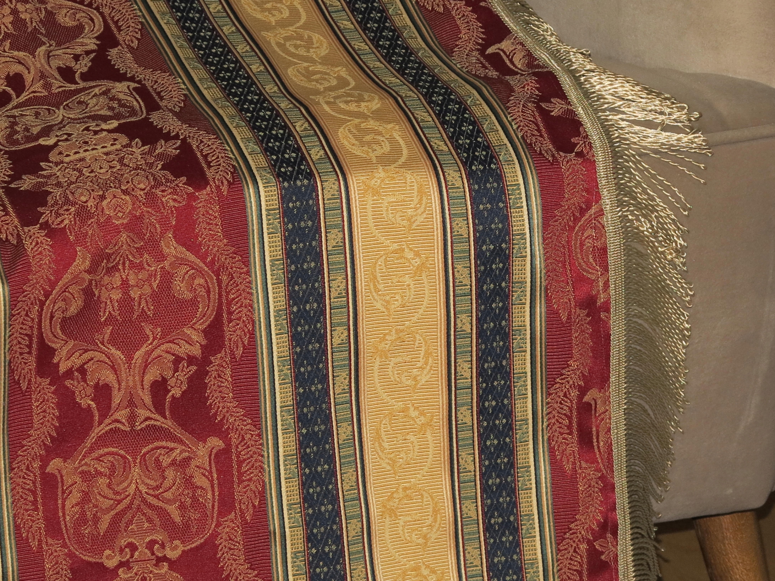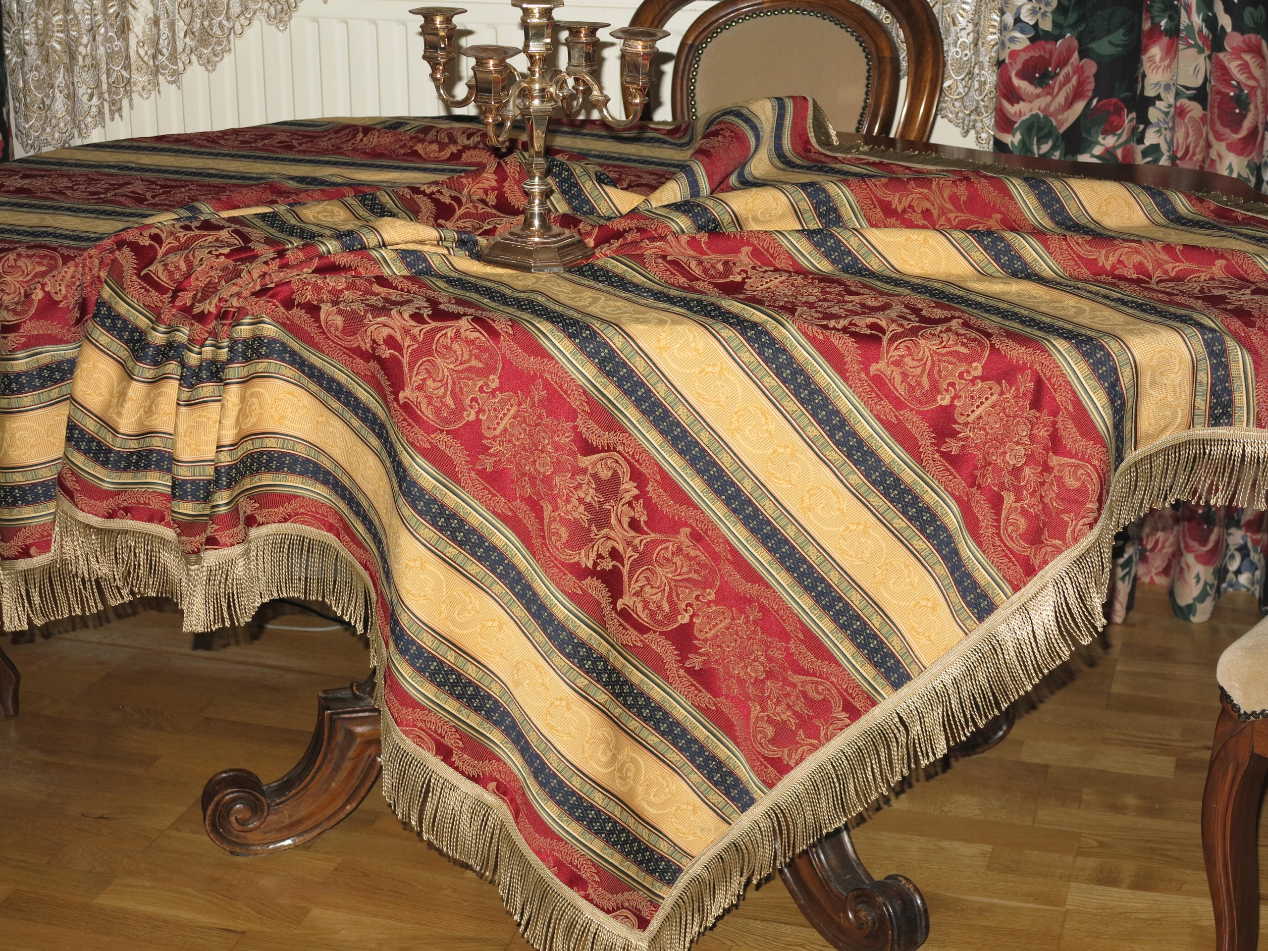 ДЛЯ ЦІНЮВАЧІВ - НАДЗВИЧАЙНО КРАСИВУ СТИЛЬНУ ВЕЛИКУ СКАТЕРТИНУ З ВІДМІННОЇ ЯКІСНОЇ ЖАККАРДОВОЇ ТКАНИНИ В СМУЖКУ LUDWIKOWSKI В бордовому, золотому та темно-синьому кольорах. ПРИКРАШЕНИЙ ДОДАТКОВИМ СТИЛЬНИМ ВІЗЕРУНКОМ. ПРО ДОВГУ БАХОМКУ.