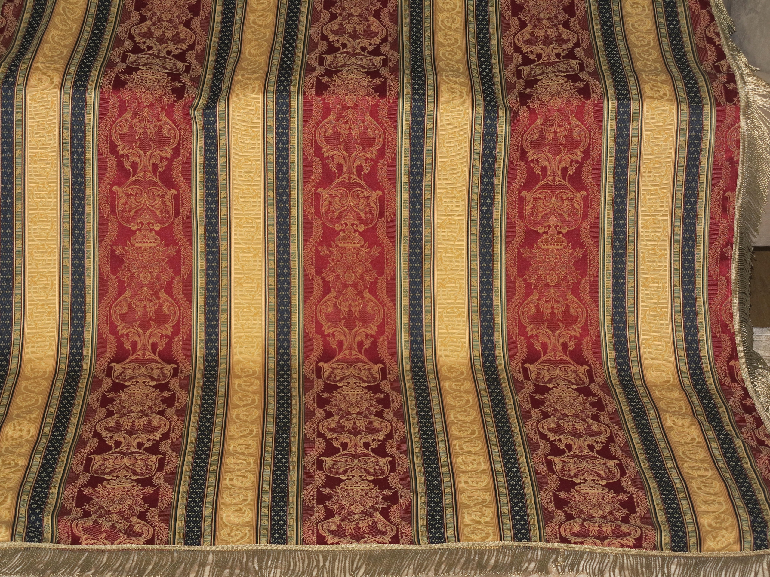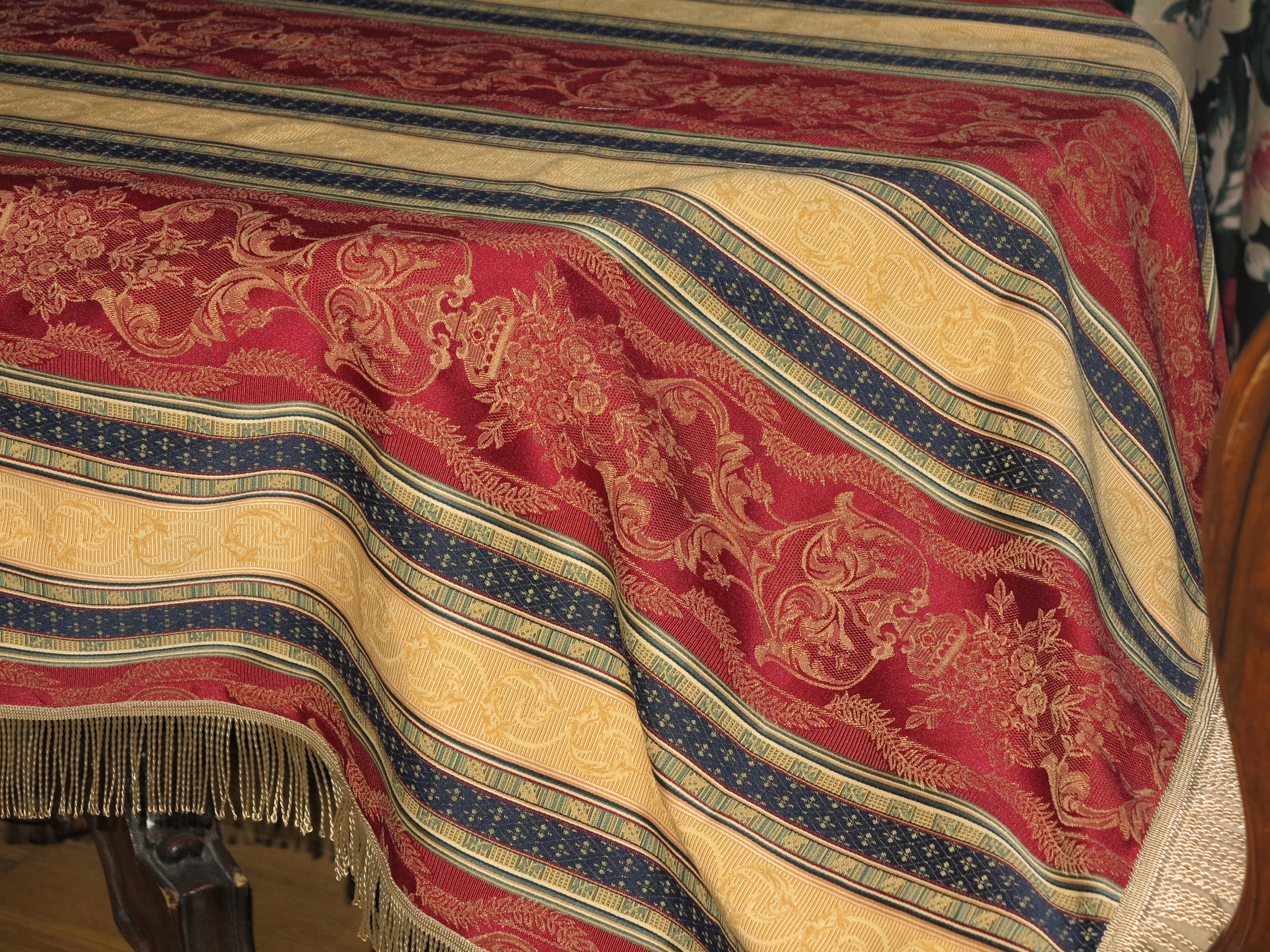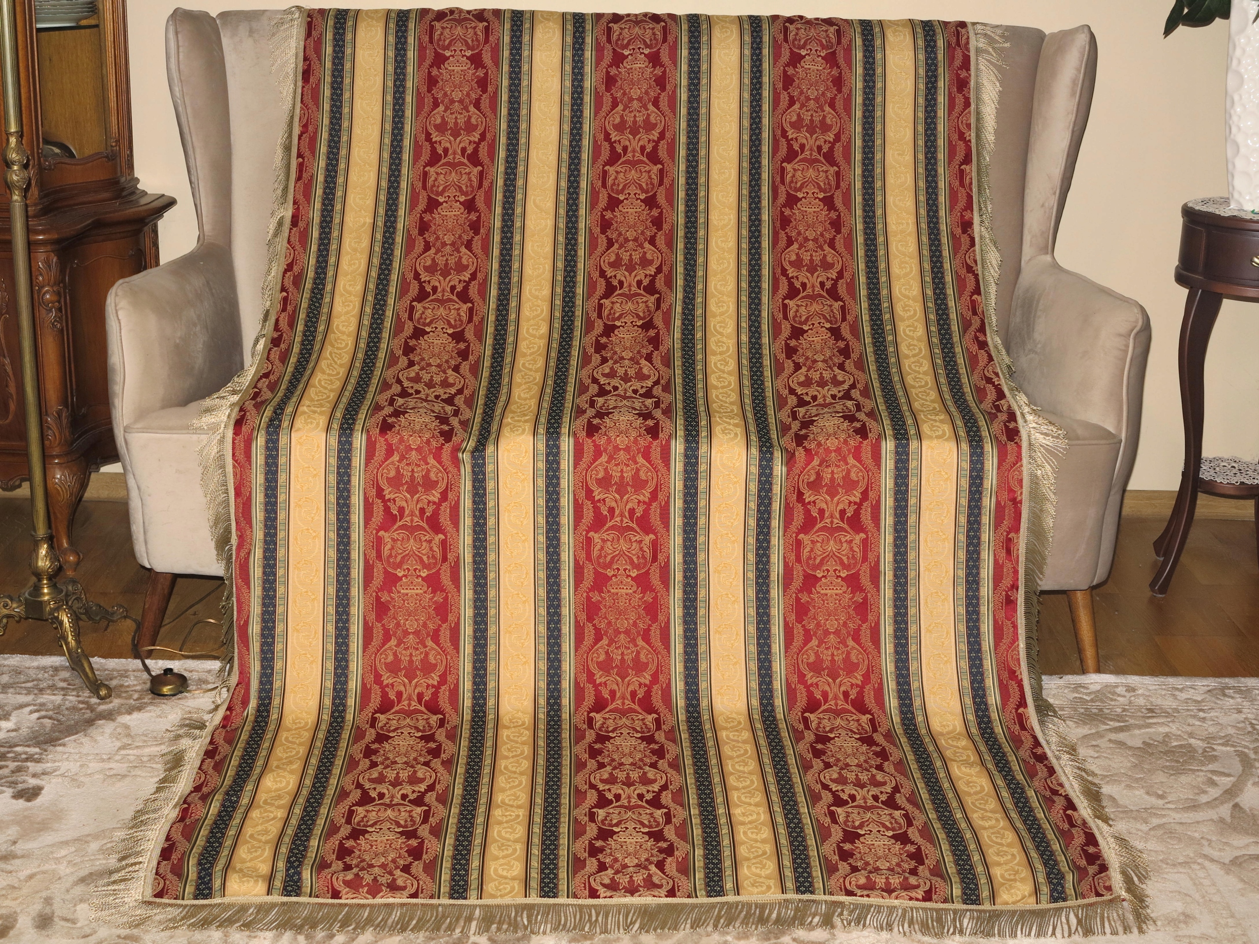 ДЛЯ ЦІНЮВАЧІВ - НАДЗВИЧАЙНО КРАСИВУ СТИЛЬНУ ВЕЛИКУ СКАТЕРТИНУ З ВІДМІННОЇ ЯКІСНОЇ ЖАККАРДОВОЇ ТКАНИНИ В СМУЖКУ LUDWIKOWSKI В бордовому, золотому та темно-синьому кольорах. ПРИКРАШЕНИЙ ДОДАТКОВИМ СТИЛЬНИМ ВІЗЕРУНКОМ. ПРО ДОВГУ БАХОМКУ.