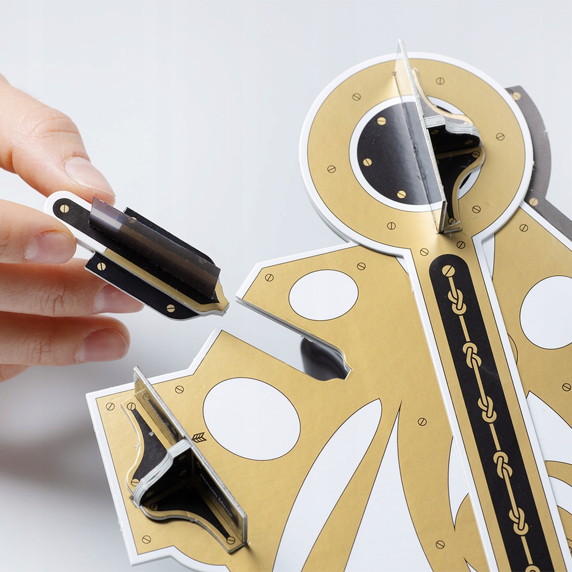 Усі пристрої виготовлені з міцного картону з чорно-золотим принтом, що надає готовим пристроям класичного елегантного вигляду. Завдяки висічці немає необхідності вирізати елементи – вони просто знімаються з листів. Польськомовна детальна інструкція крок за кроком проведе вас через весь процес будівництва. Завершений пристрій відтворює основні функції свого оригіналу.
