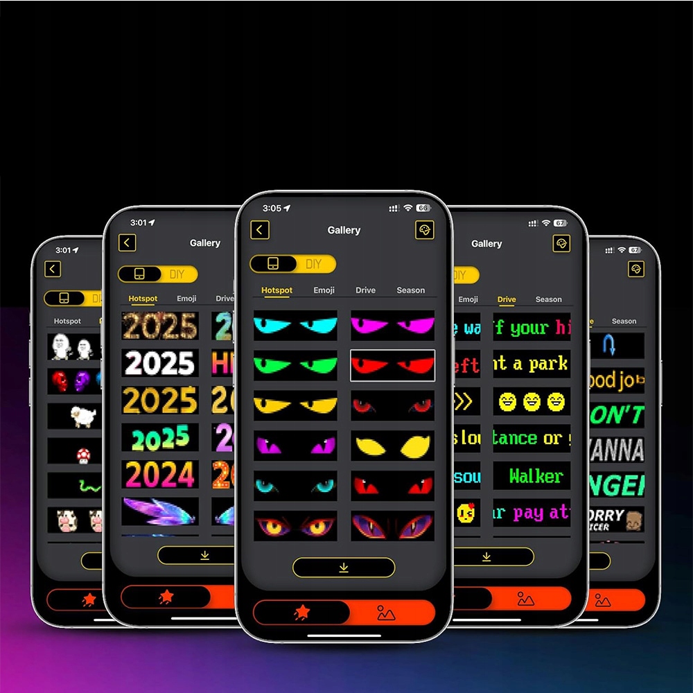 Світлодіодні очі до вантажних автомобілів дозволяють легко керувати м'яким екраном за допомогою спеціального мобільного додатка. Виберіть з різних дизайнів очей або створіть власну анімацію самостійно та текстових анімацій, щоб висловити свій унікальний стиль.