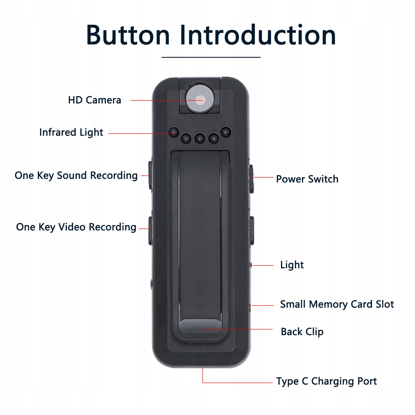 1, КІЛЬКА ФУНКЦІЙ: Ця камера підтримує запис аудіо, відео та фотографій із функцією запису та зберігання на флеш-диск USB, що зручно та практично. 2. УПРАВЛІННЯ КНОПКАМИ: незалежна камера з кнопкою запису аудіо, яку можна легко натиснути для виконання завдань запису та аудіо в особливих або екстрених ситуаціях. 3, ВИЯВЛЕННЯ РУХУ: ця камера високої чіткості підтримує виявлення руху та зйомку, автоматично записуючи відео, коли об’єкт рухається. 4, РОЗДІЛЬНА ДІЯЛЬНІСТЬ HD: використання оптичного об’єктива CMOS, нестиснений формат AVI, зйомка високої роздільної здатності 1080P із чіткою та видимою якістю зображення. 5、Гнучка конструкція: об’єктив, що обертається на 180 градусів, зйомка в широкому діапазоні світла, дизайн кліпси, можна покласти в кишеню чи книгу або закріпити на кронштейні чи кермі. 6, ІНШІ ХАРАКТЕРИСТИКИ: підтримує невелику карту пам’яті 4 ГБ-128 ГБ, підтримує швидку зарядку Type-C, що забезпечує швидку передачу даних і зарядку.