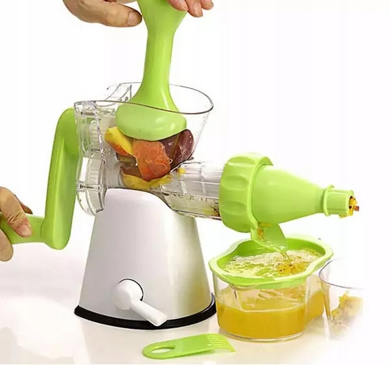 ✅ Помістіть дві посудини під головку, помістіть фрукти в соковижималку та почніть вичавлювати сік, повертаючи ручку