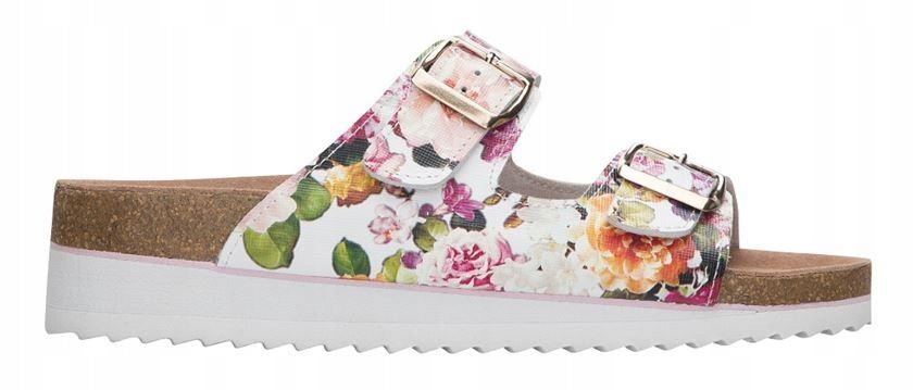 Легкі та елегантні жіночі пробкові тапочки з піднятою підошвою в області каблука. Застібається двома срібними пряжками, шкіряний верх з красивим квітковим візерунком забезпечує не тільки комфорт під час працює, але також дуже гарно виглядає. Крім того, верх покритий поліуретановим покриттям, а комфорт коркової підошви підвищується завдяки використанню піни EVA та профільованої м’якої устілки. Глибокий малюнок на підошві забезпечує стійкість навіть на слизькій поверхні.