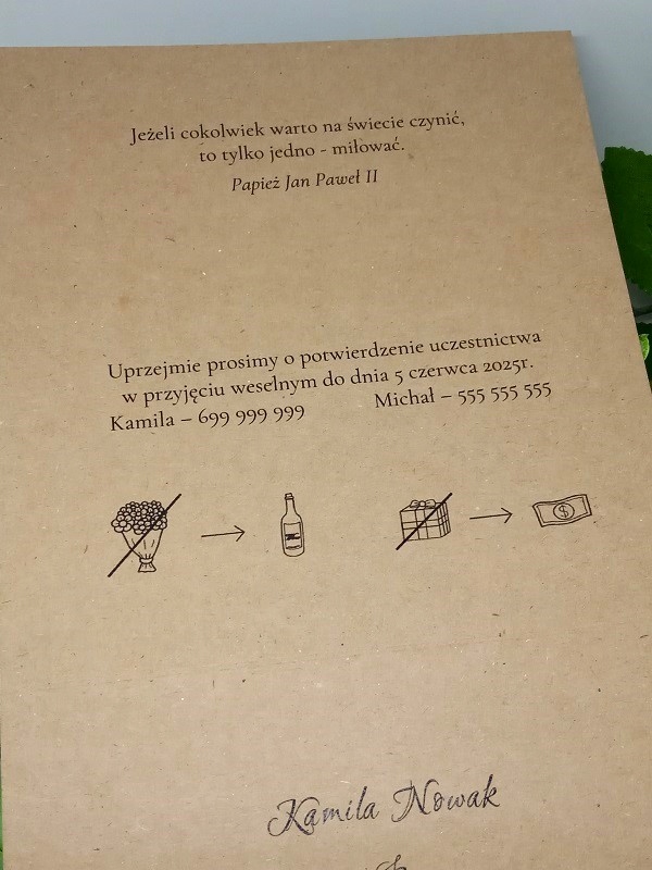 - Запрошення виготовлено з екологічного паперу коричнево-сірого кольору щільністю 250г/м2.