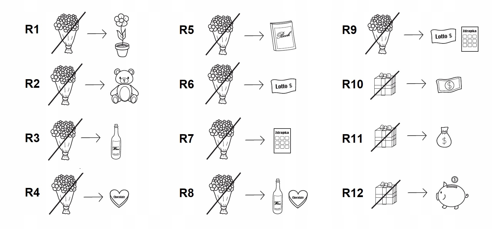 - номер малюнків щодо подарунків (наприклад, R1 і R12),