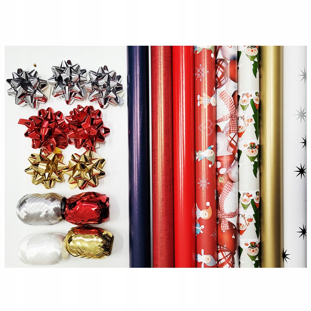 8 рулонів обгорткового паперу довжиною 2 м і шириною 57 см 7 розеток (2 золотих, 2 червоних і 3 срібних) 4 стрічки (золота, червона 10 м і біла і срібна 20 м)