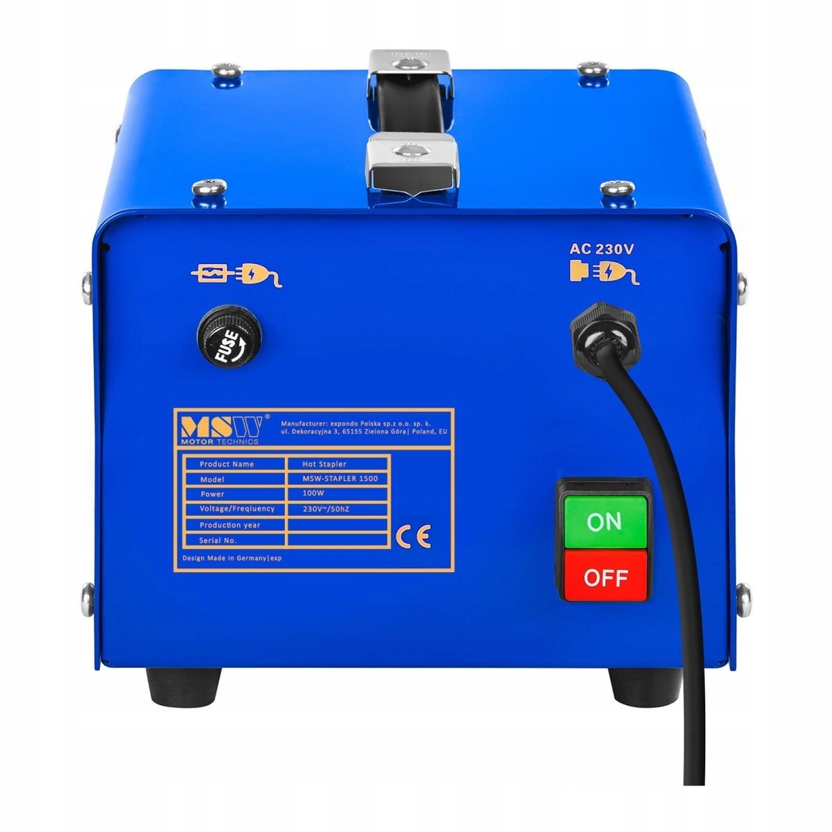 Ергономіка - модель MSW-STAPLER 1500 - це компактний пристрій з мала вага і габарити. Його легко переносити з місця на місце (є зручна ручка) і підключати до стандартного джерела живлення 230 В. Гумові нековзні ніжки гарантують стійкість.