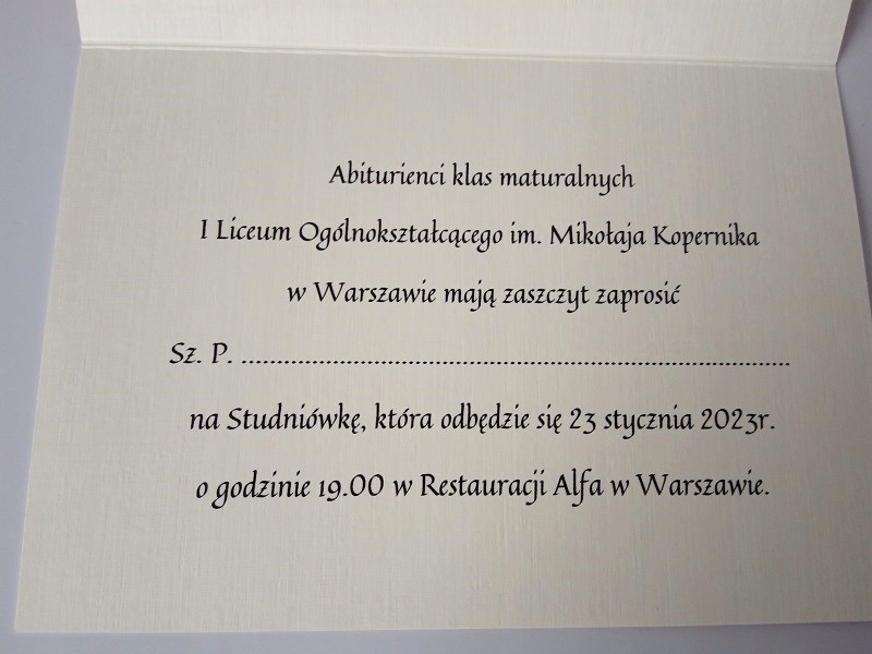 Почесний колегіум I Liceum Ogólnocące im. Микола Коперник за старою польською традицією організовує випускний бал у ресторані ALFA за 100 днів до випускного іспиту 28 січня Anno Domini 2023 року, коли годинник проб’є 20:00.