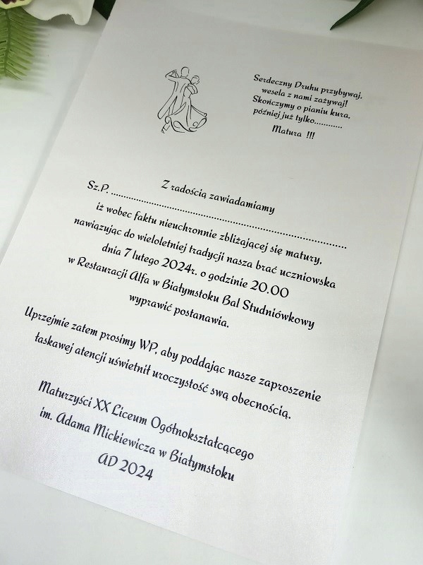 що у зв'язку з тим, що випускні іспити в середній школі неминуче наближаються, наш брат-студент вирішує організувати випускний бал 12 лютого 2023 року о 9 год. 00:00 в ресторані ALFA в Любліні, посилаючись на багаторічну традицію.