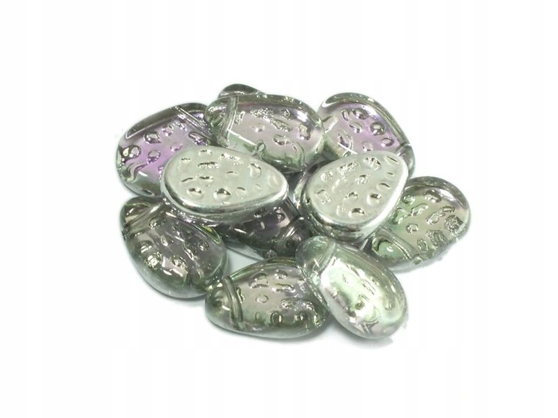 високоякісна скляна скляна скляна намистина, плоска з розмірами приблизно. 11x9 мм, отвір діаметром близько 0,8 мм проходить через кінчик намистини. Кристал, мерехтливий всередині бісеру фіолетового, з металевим срібним дном, зубчастим для зміцнення ефекту. Зроблено в Чехії.