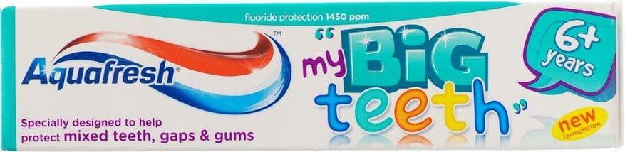 Зубна паста⭐Aquafresh Big Teeth⭐ розроблена спеціально для дітей, з урахуванням ніжних зубів і ясендітей 6-8 років з молочними і першими постійними зубами.