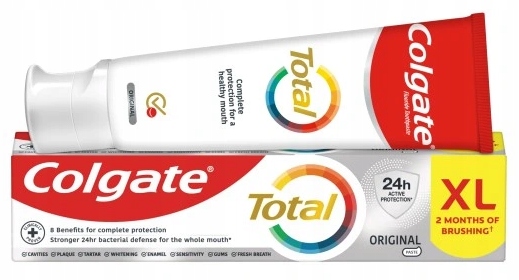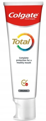 Зберегти міцна, здорова та захищена посмішка під час чищення зубів зубною пастою зуби Colgate Total Original. Ця зубна паста допомагає зберегти вашу посмішку здоровою відмінний стан, забезпечує сильніший 24-годинний захист бактерії* всієї ротової порожнини! На додаток до чудового* зменшення бактерій зубів, язика, щік і ясен* ця зубна паста унікальна також забезпечує антибактеріальну технологію з подвійним цинком довготривалий активний захист*.